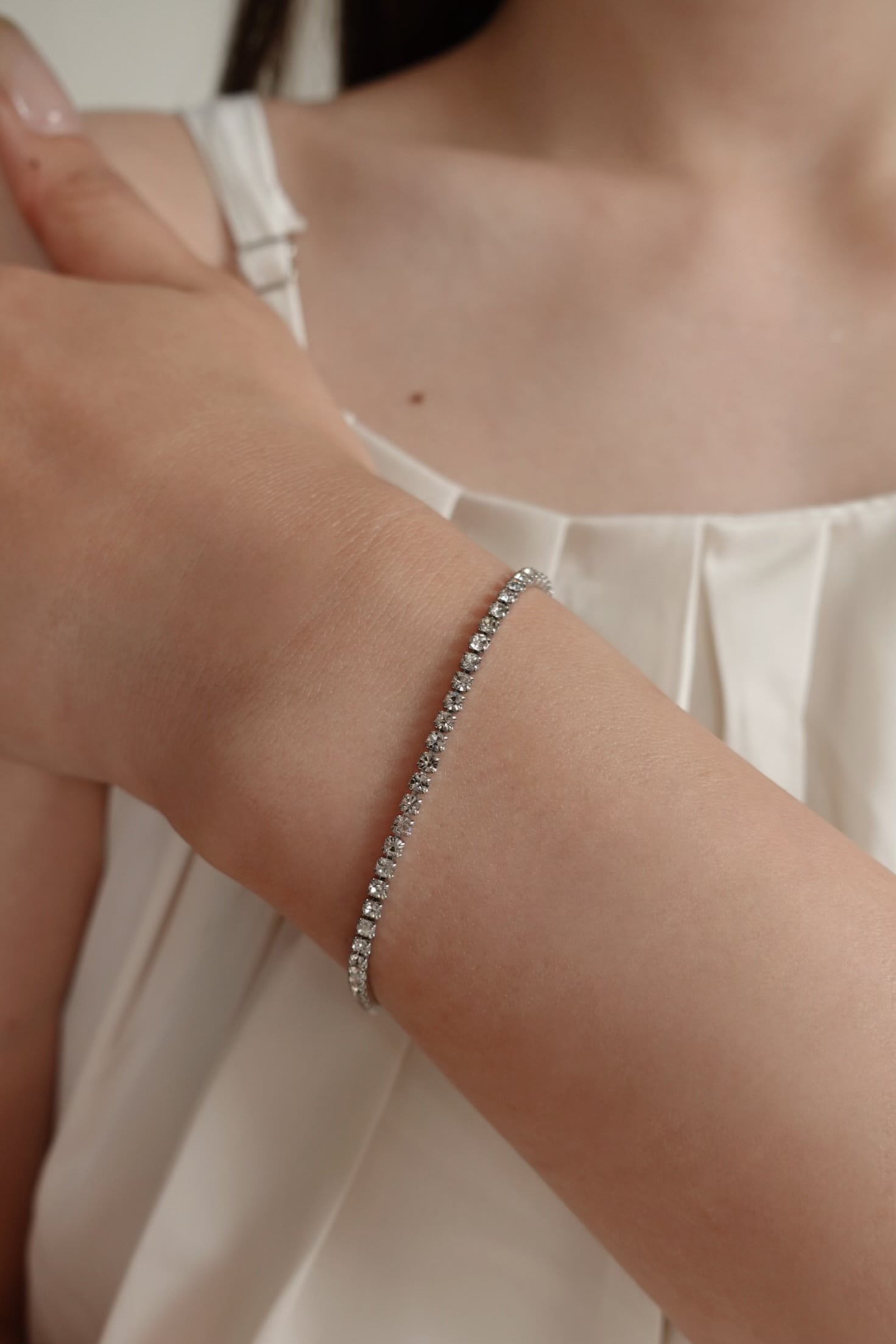 定番のテニスブレスレットをさりげなく上品に作成したアイテムです。