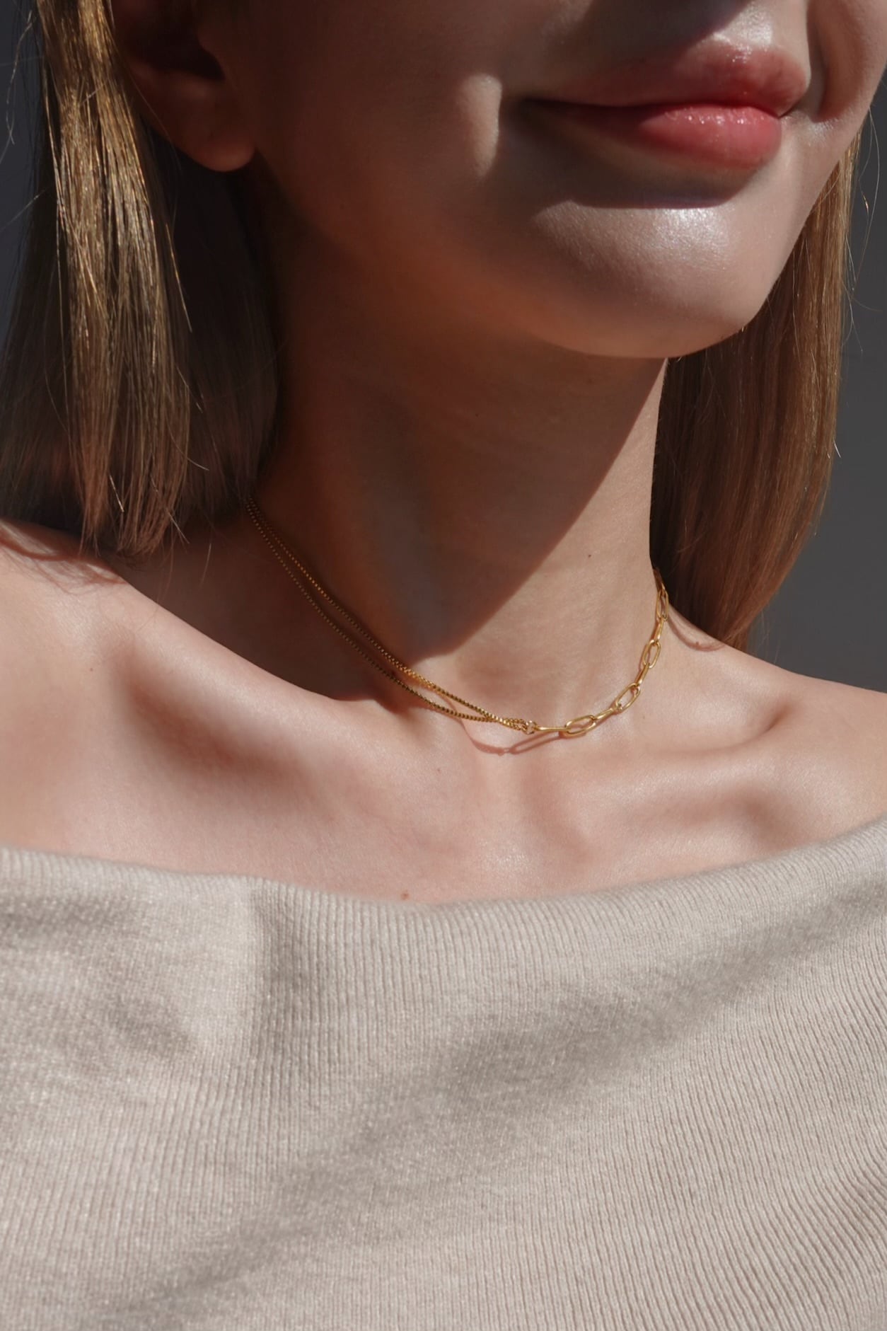細やかに輝くボックスチェーンと、立体感のあるペーパークリップチェーンを組み合わせることで、シンプルながらも奥行きのある印象に仕上げました。