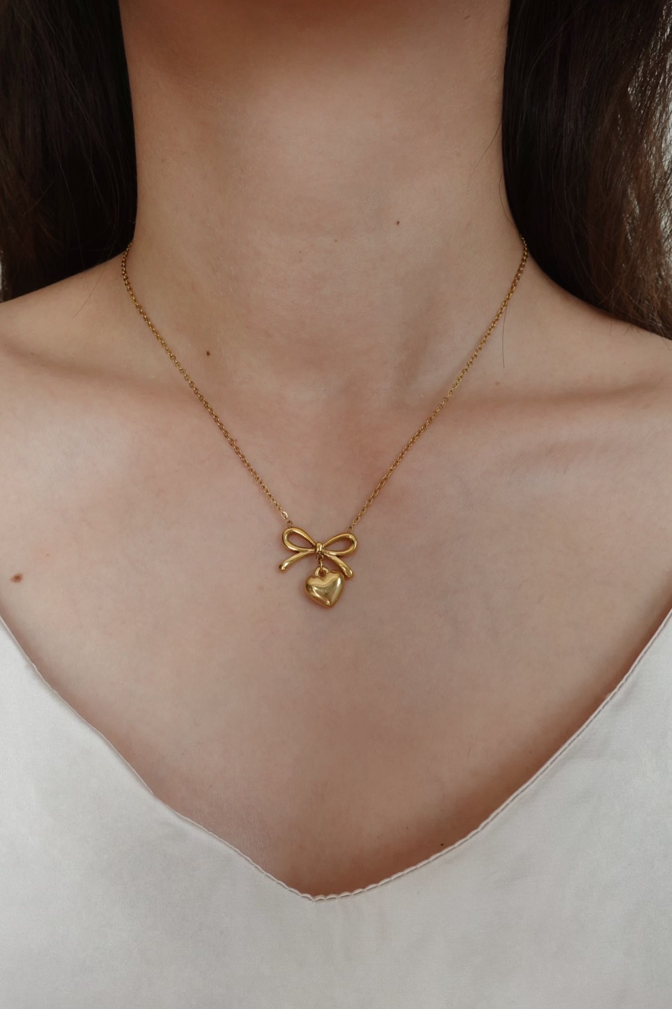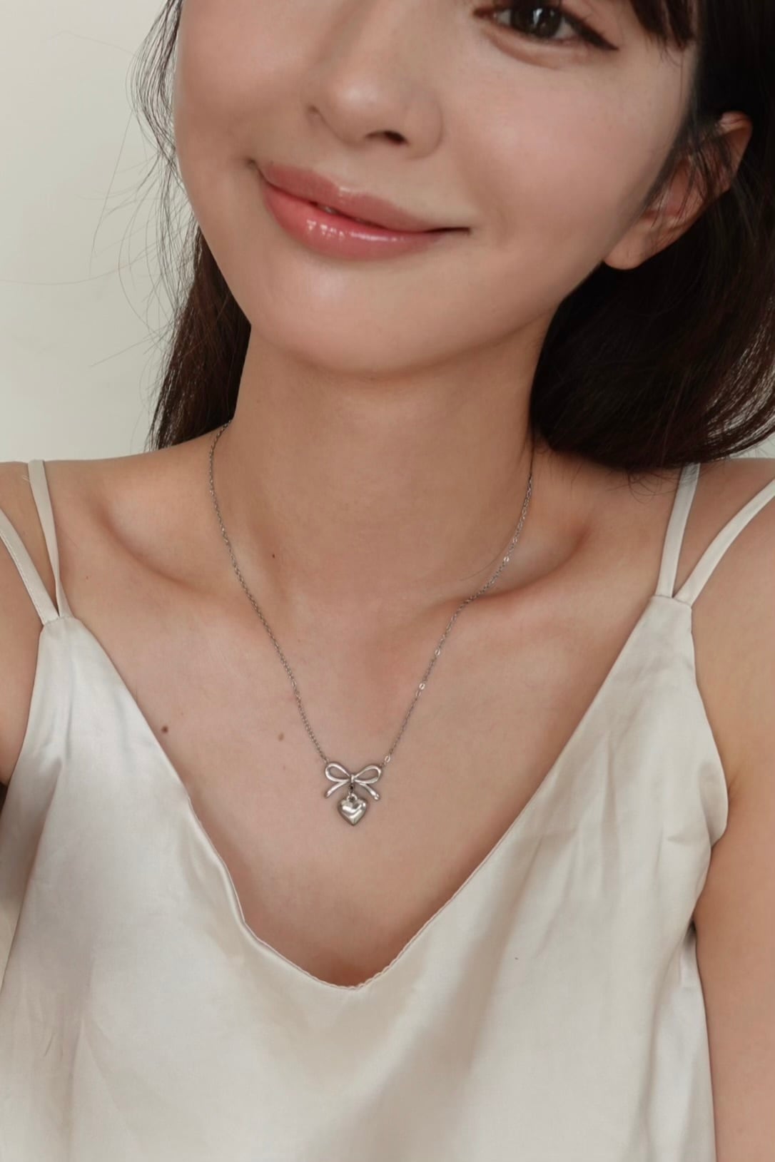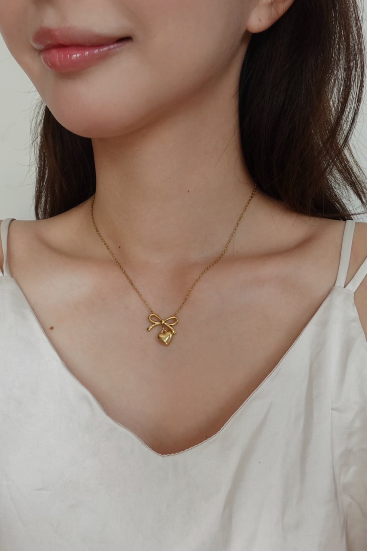 愛らしいリボンモチーフに、ころんとしたハートを組み合わせたネックレス。
