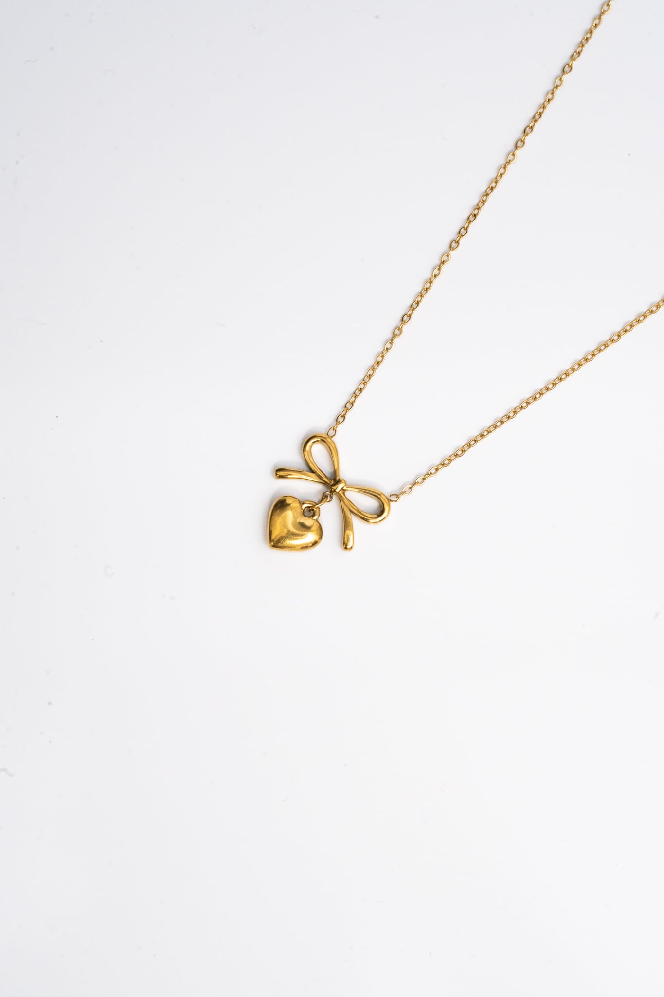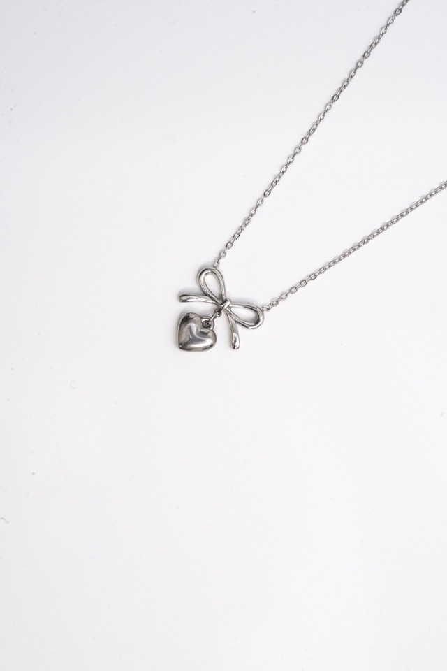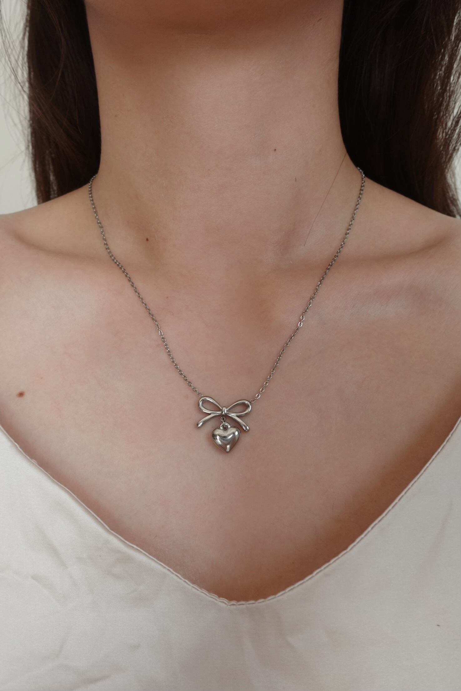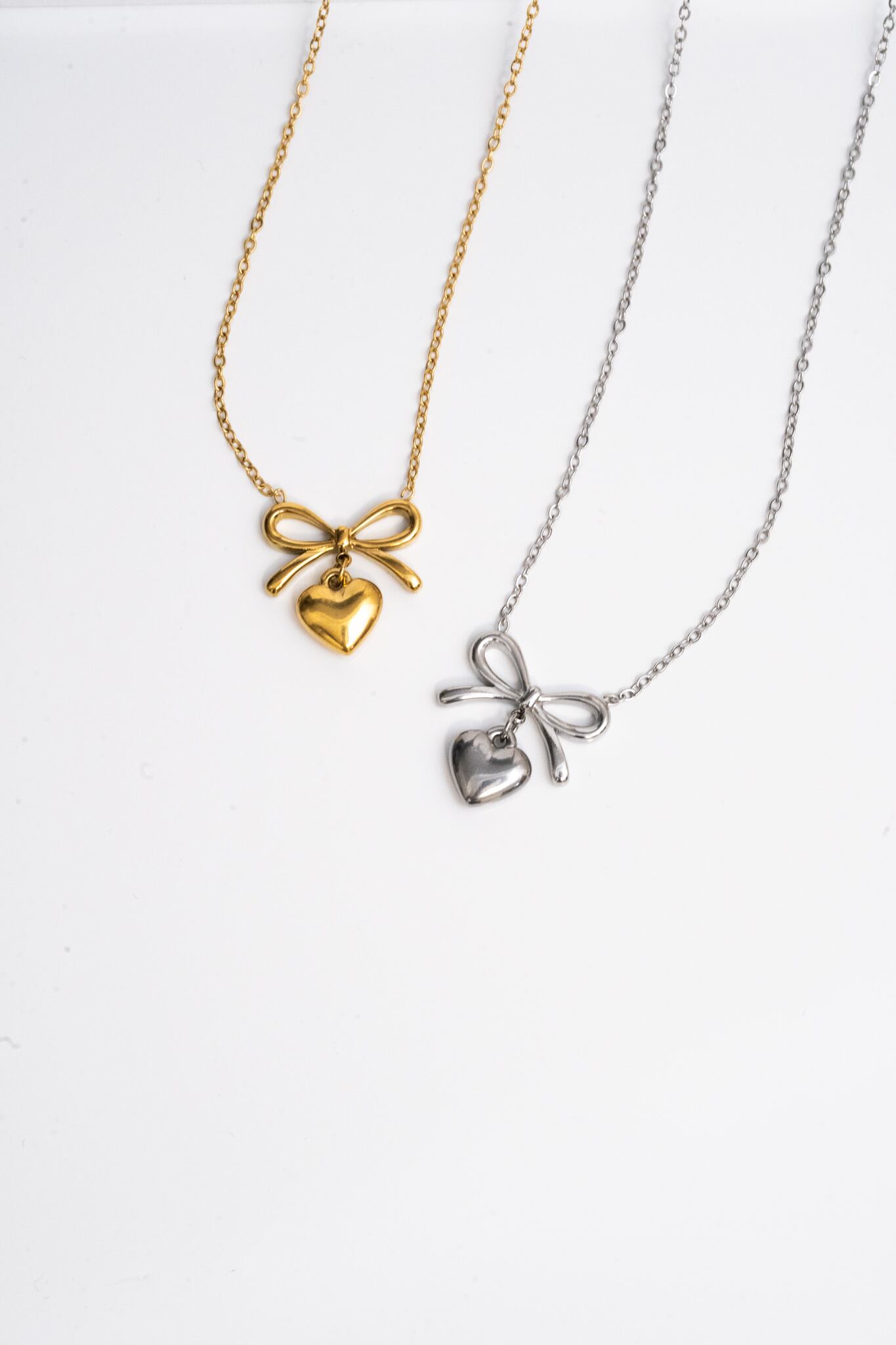 愛らしいリボンモチーフに、ころんとしたハートを組み合わせたネックレス。