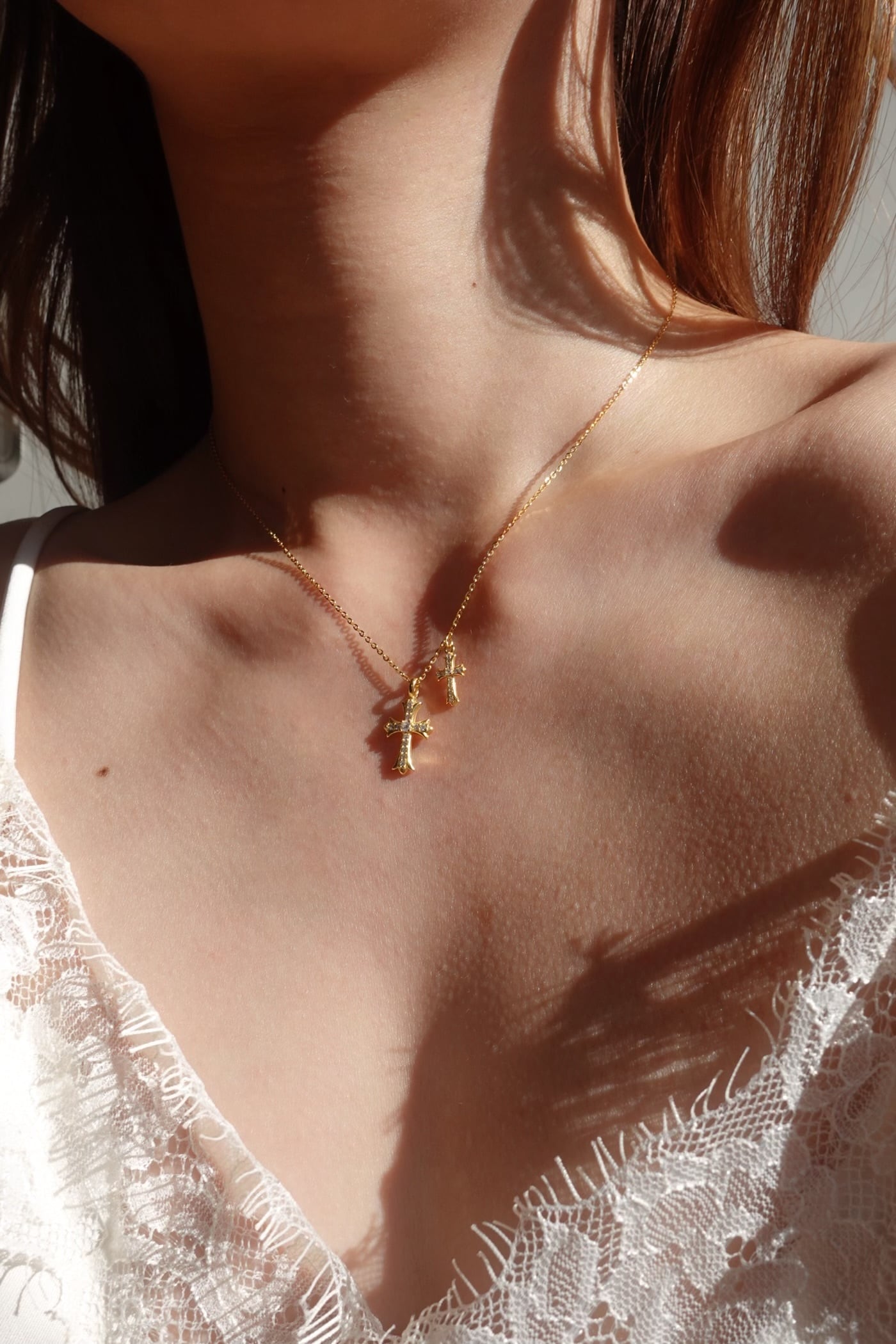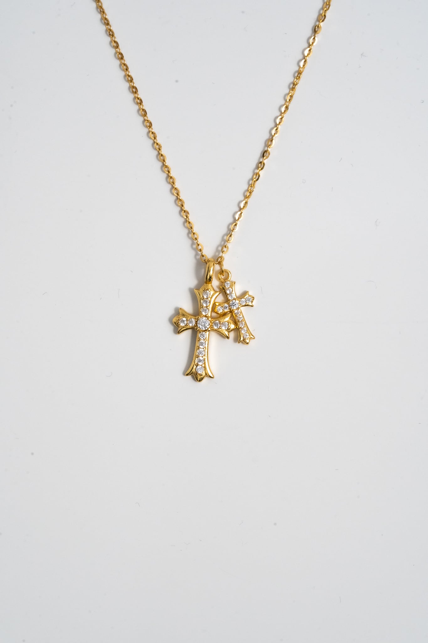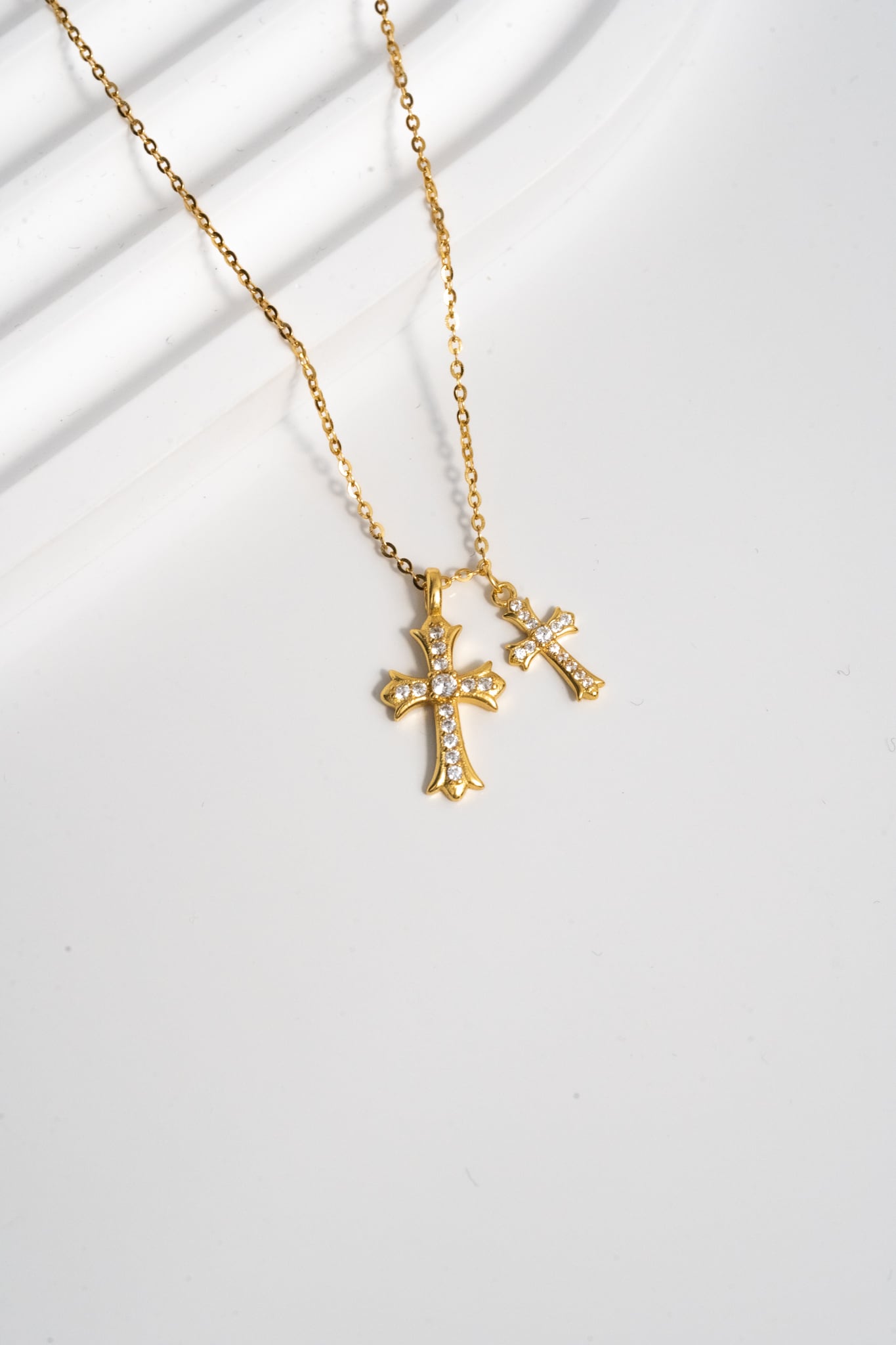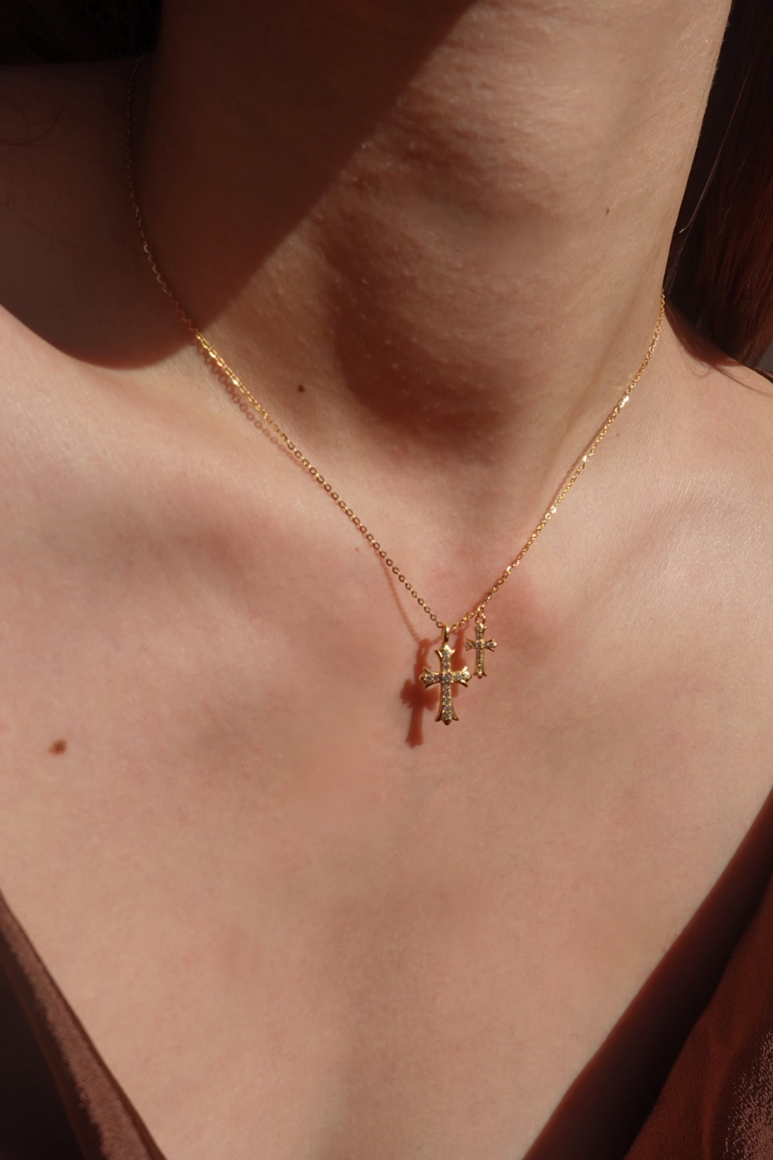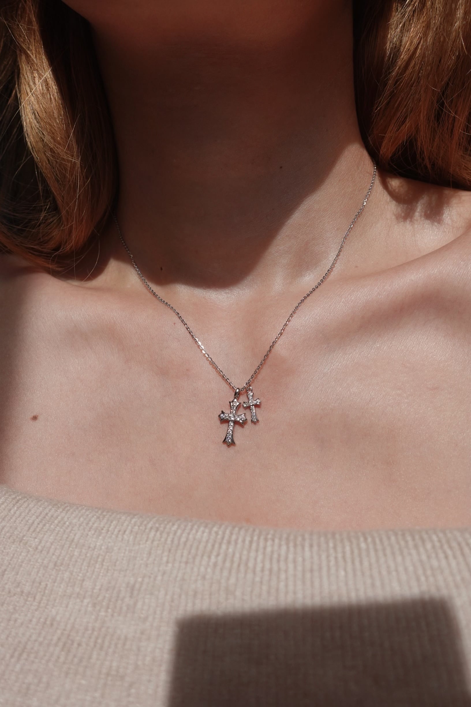 大小異なる2つのクロスモチーフを組み合わせた、存在感のあるネックレス。