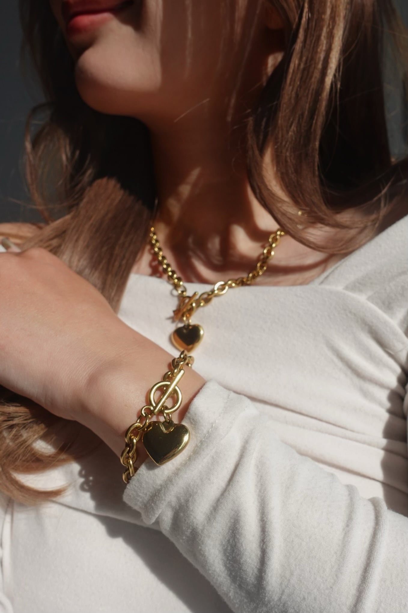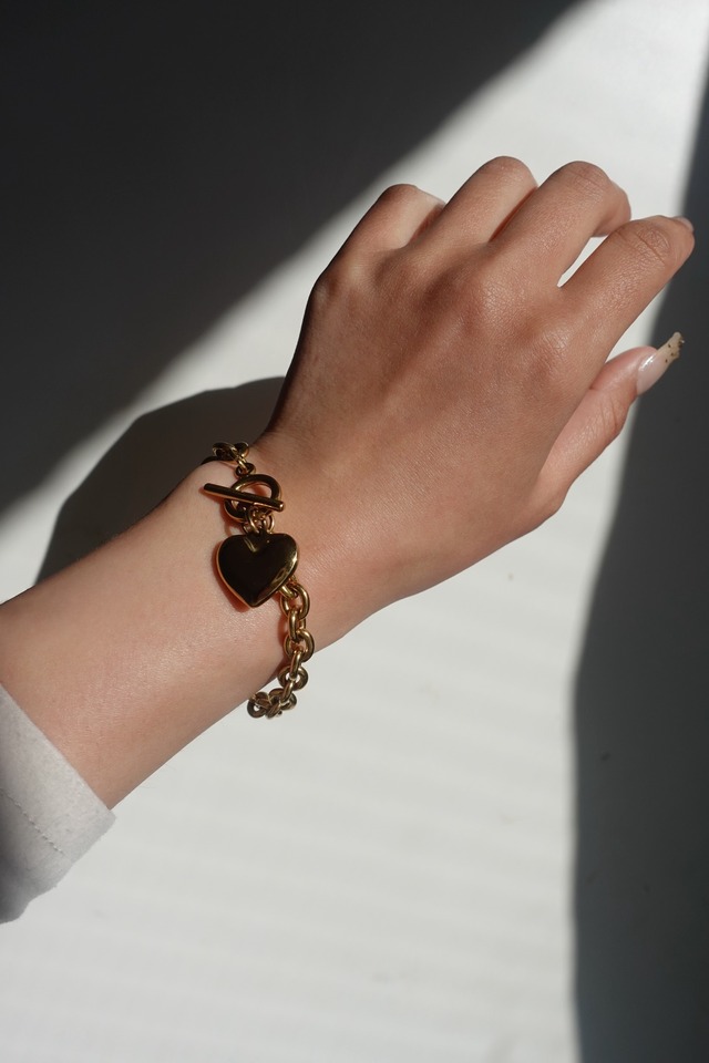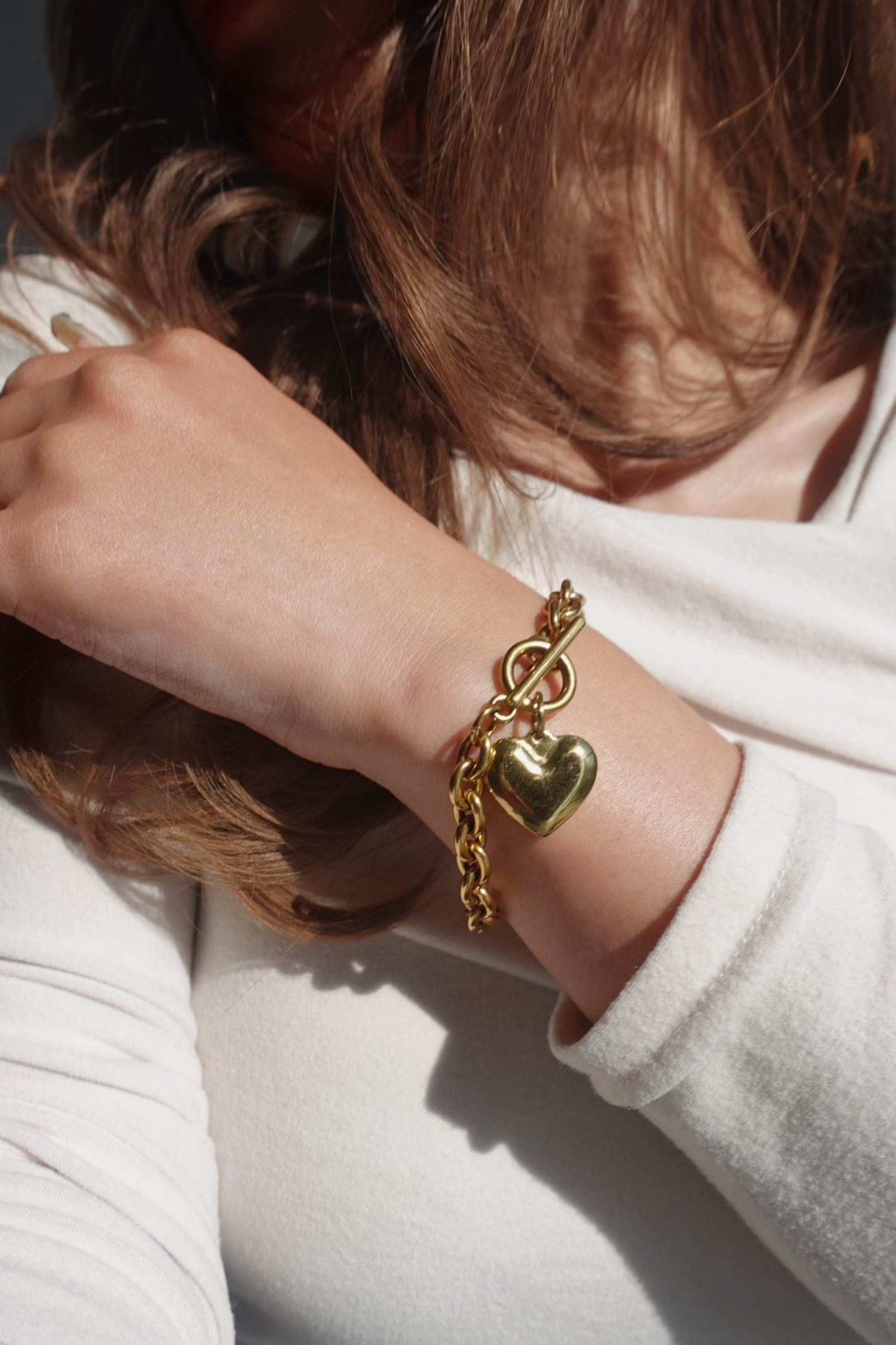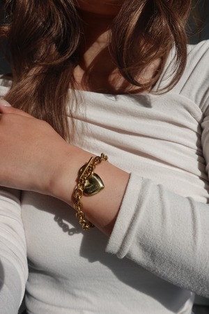 程よい存在感のチェーンに、艶やかなハートモチーフを添えたブレスレット。