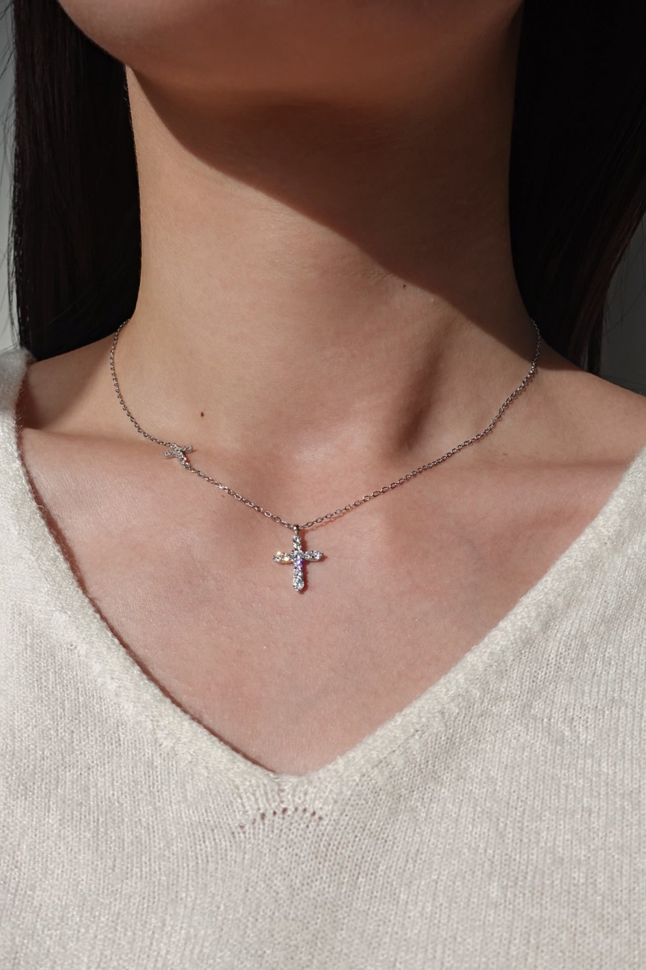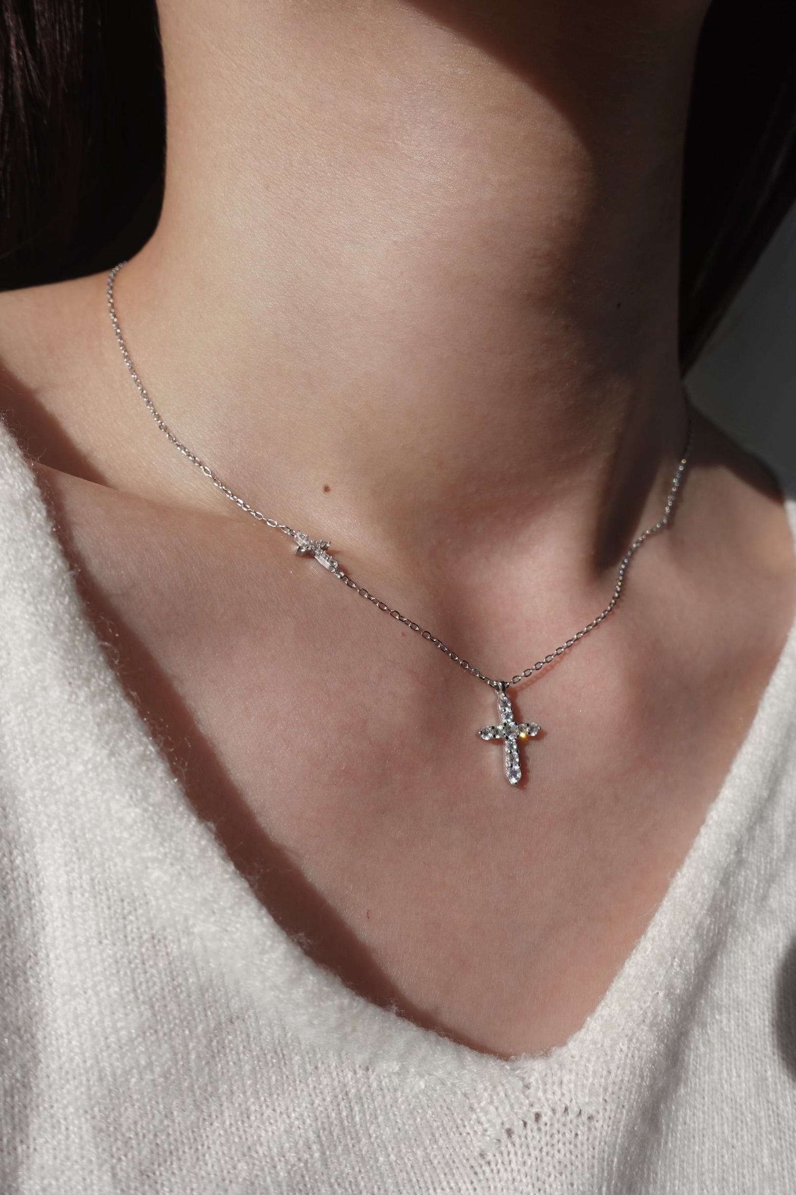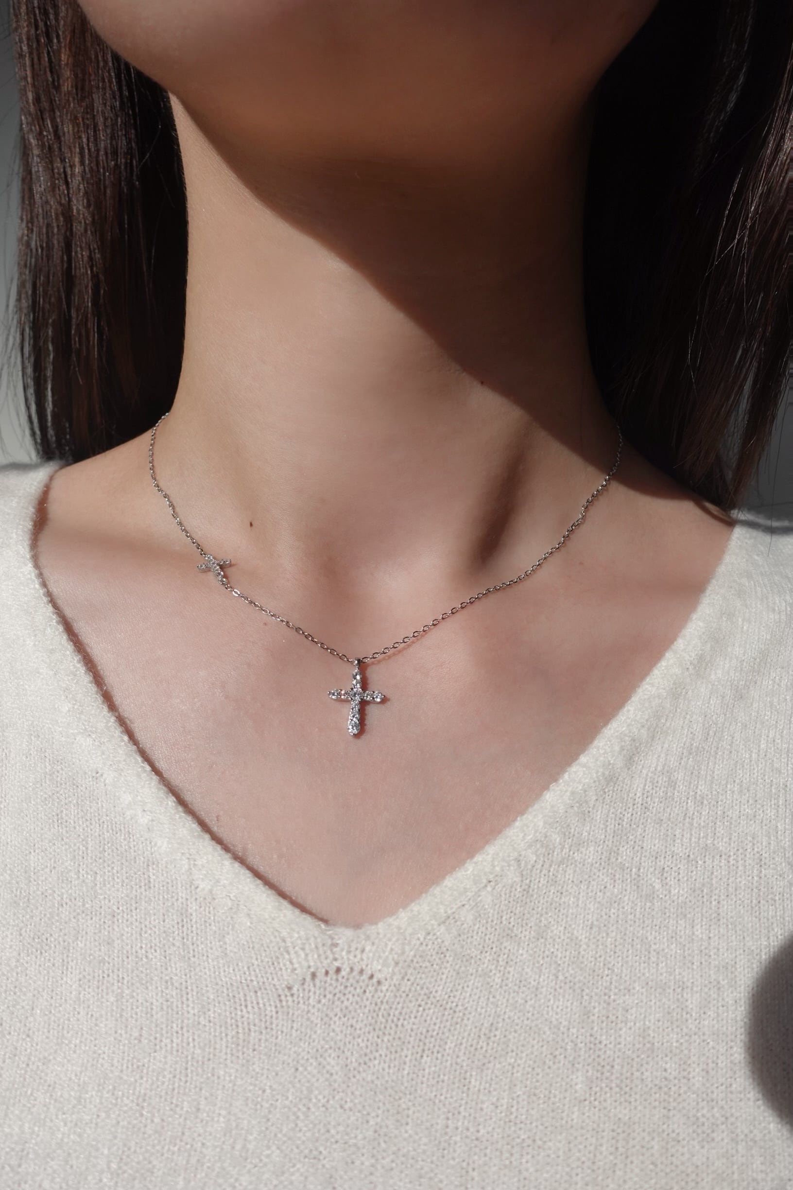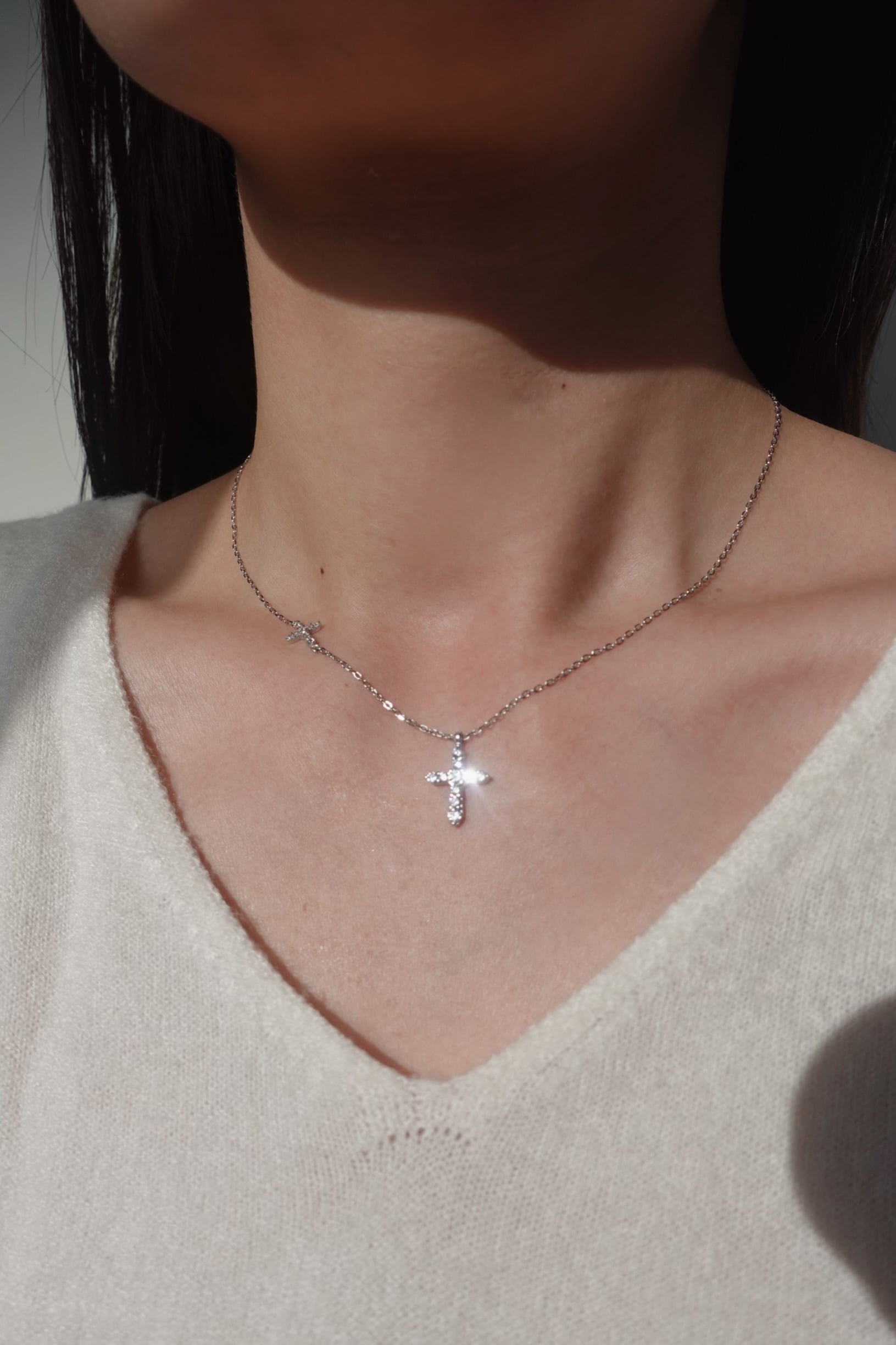 固定されたミニクロスと、動きに合わせて揺れるクロスを組み合わせた、上品な表情のダブルクロスネックレス。
