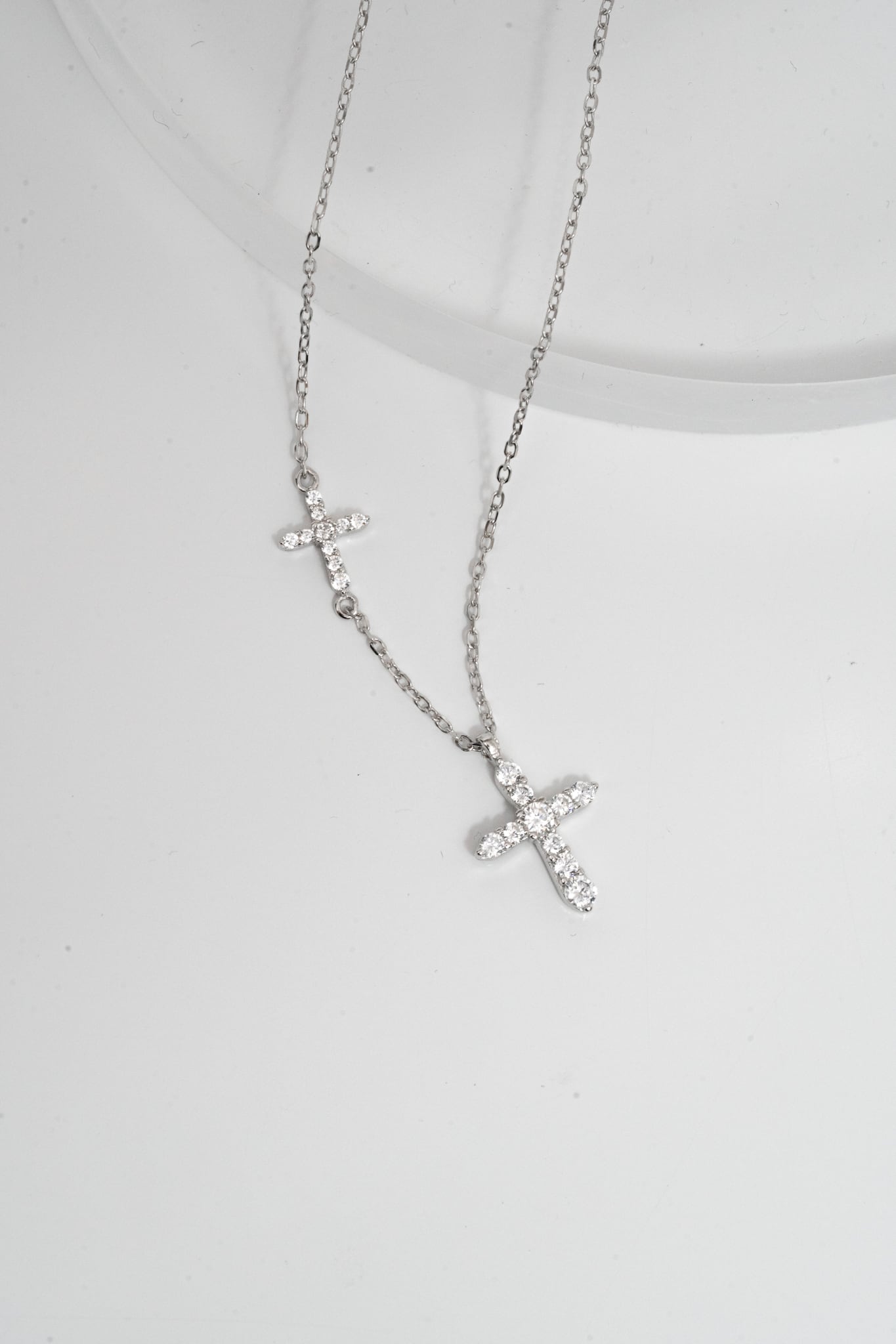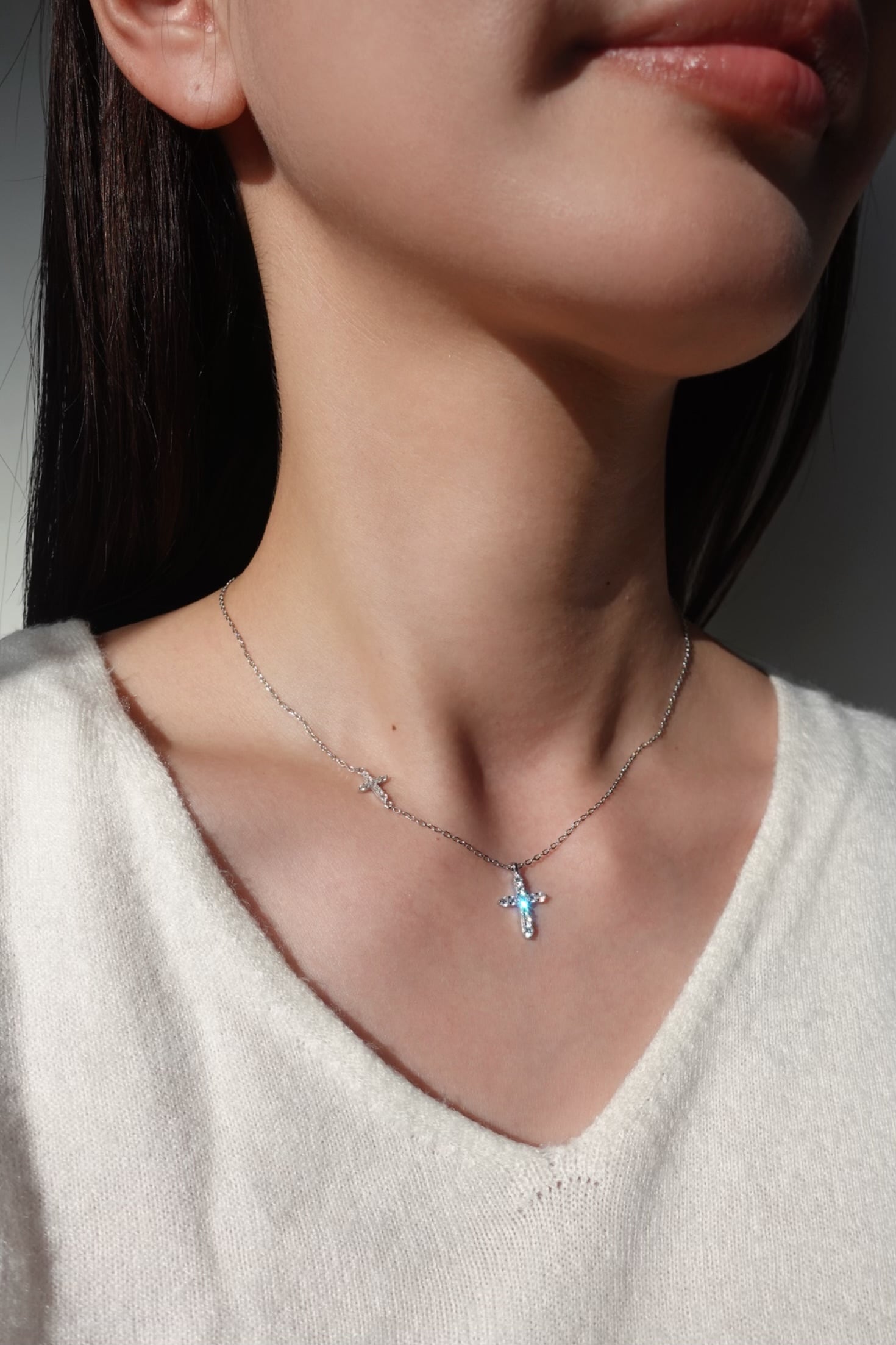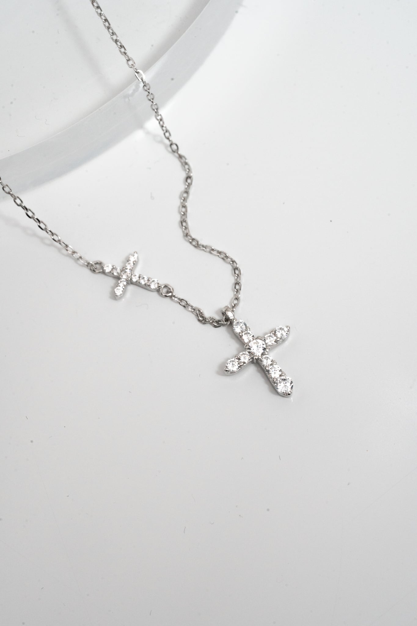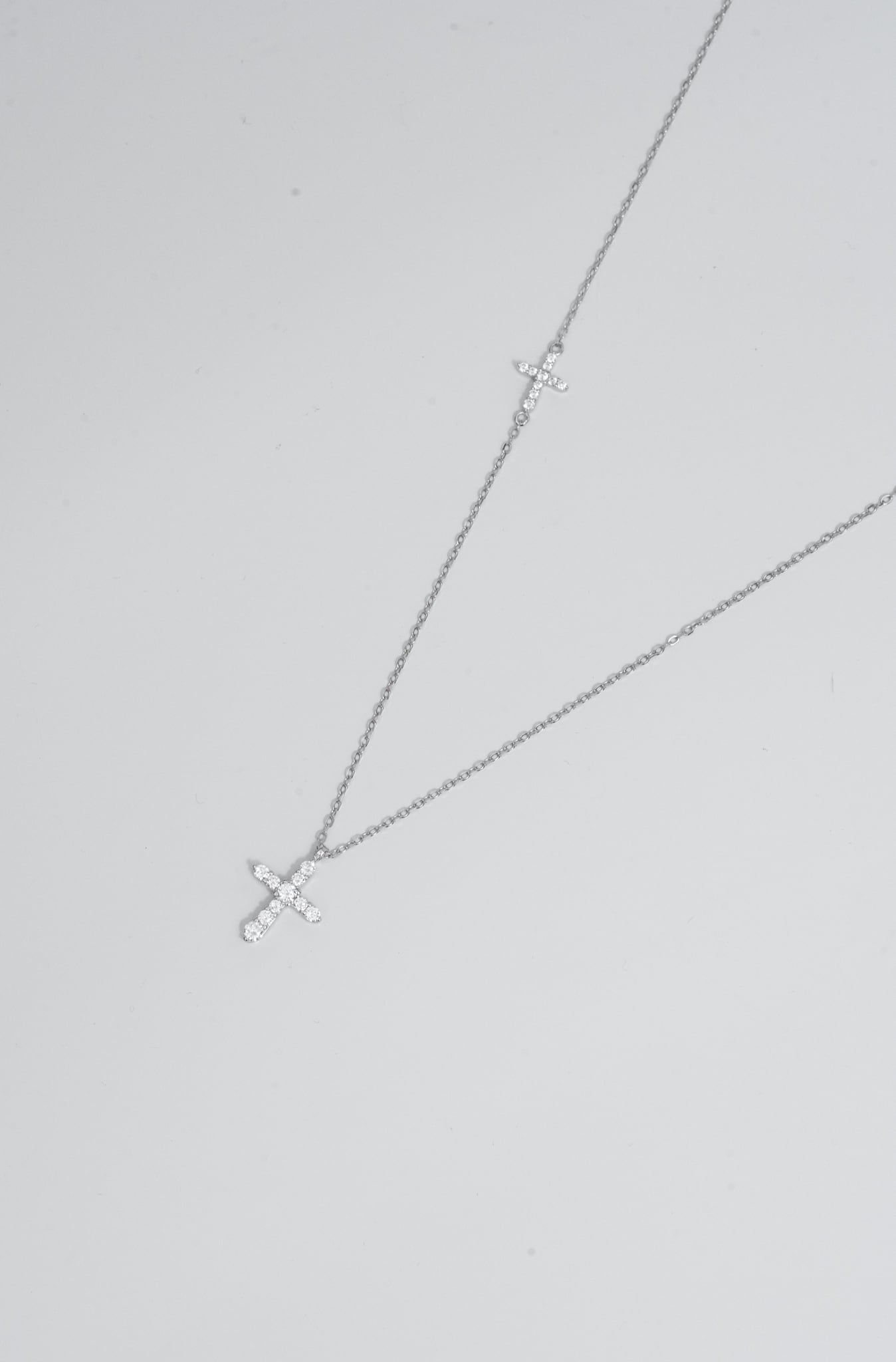 固定されたミニクロスと、動きに合わせて揺れるクロスを組み合わせた、上品な表情のダブルクロスネックレス。