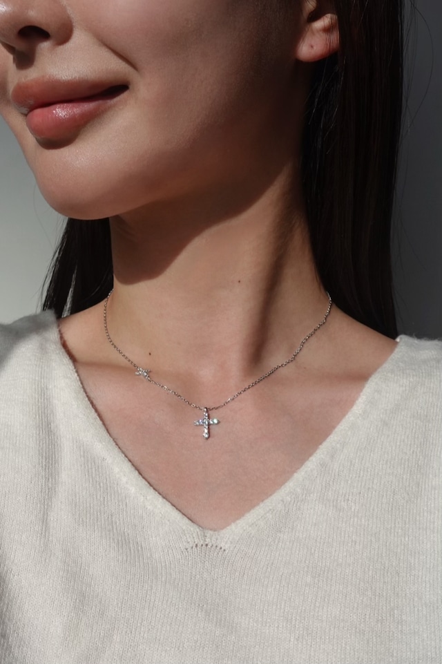 デコルテラインに沿う位置に配されたミニクロスは、さりげなく肌に溶け込み、