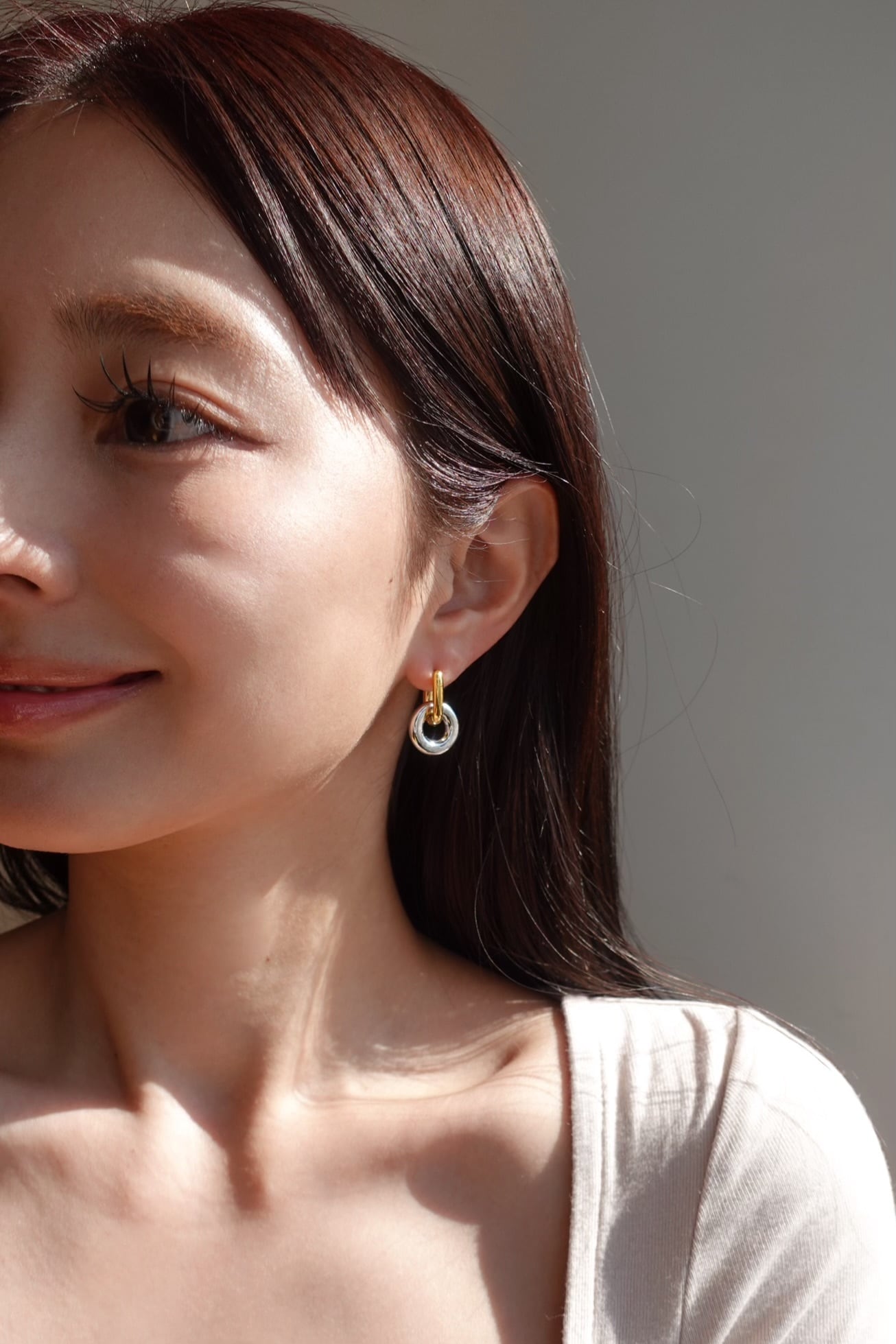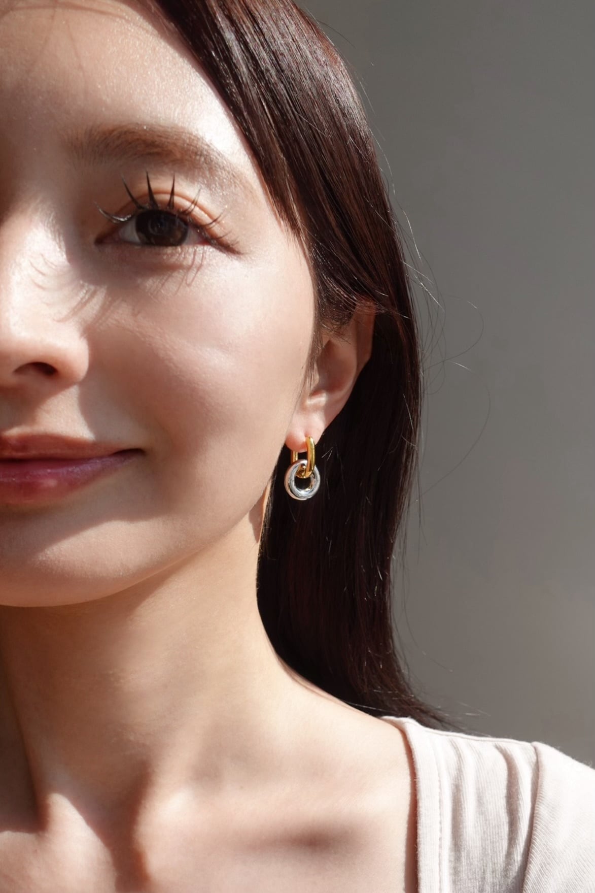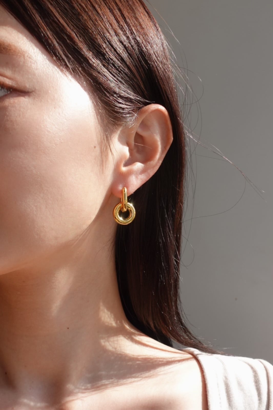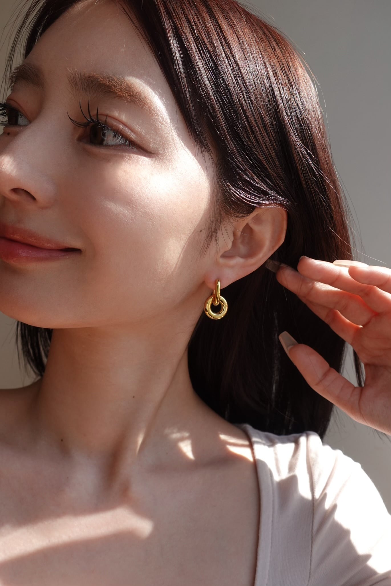 なめらかな曲線のゴールドフープに、モダンなリングモチーフをプラス。