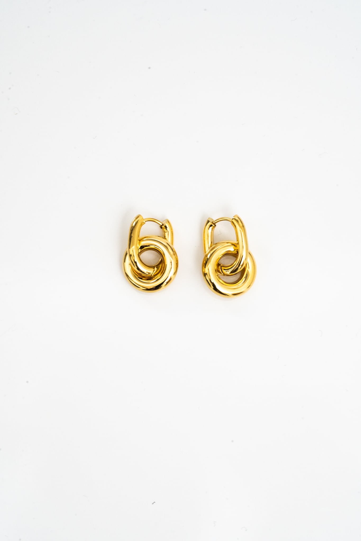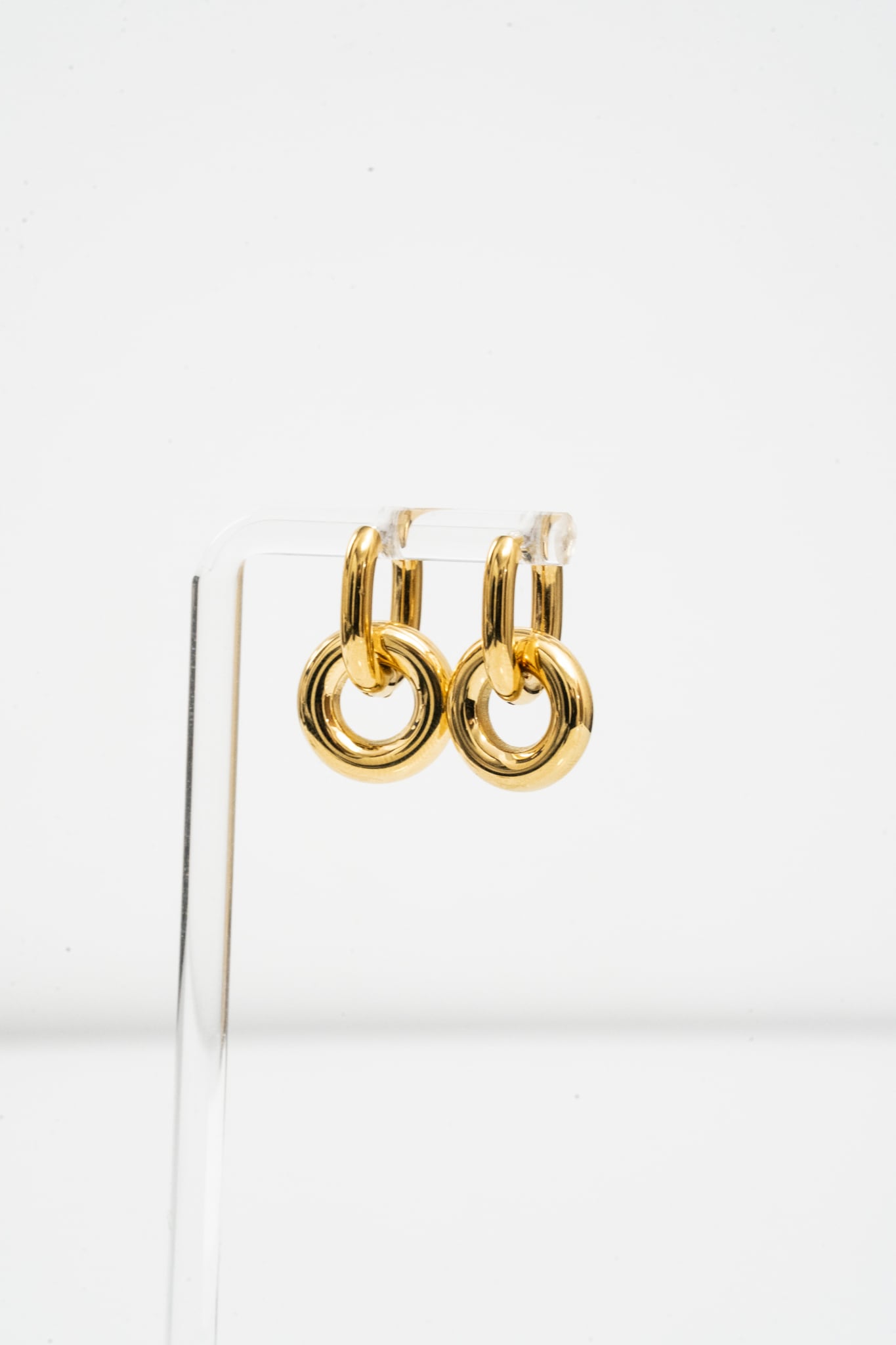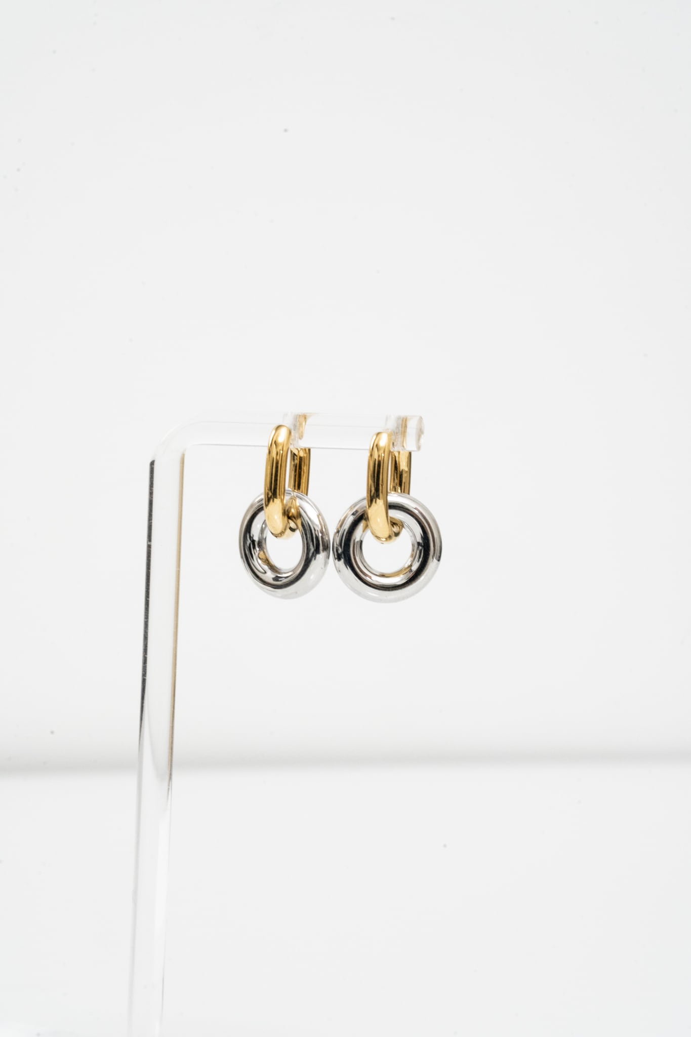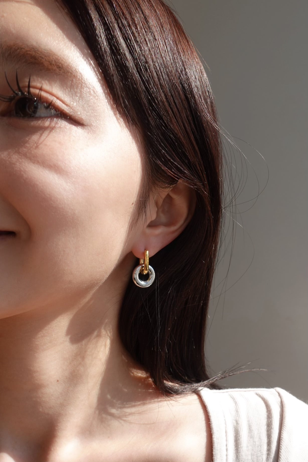 なめらかな曲線のゴールドフープに、モダンなリングモチーフをプラス。