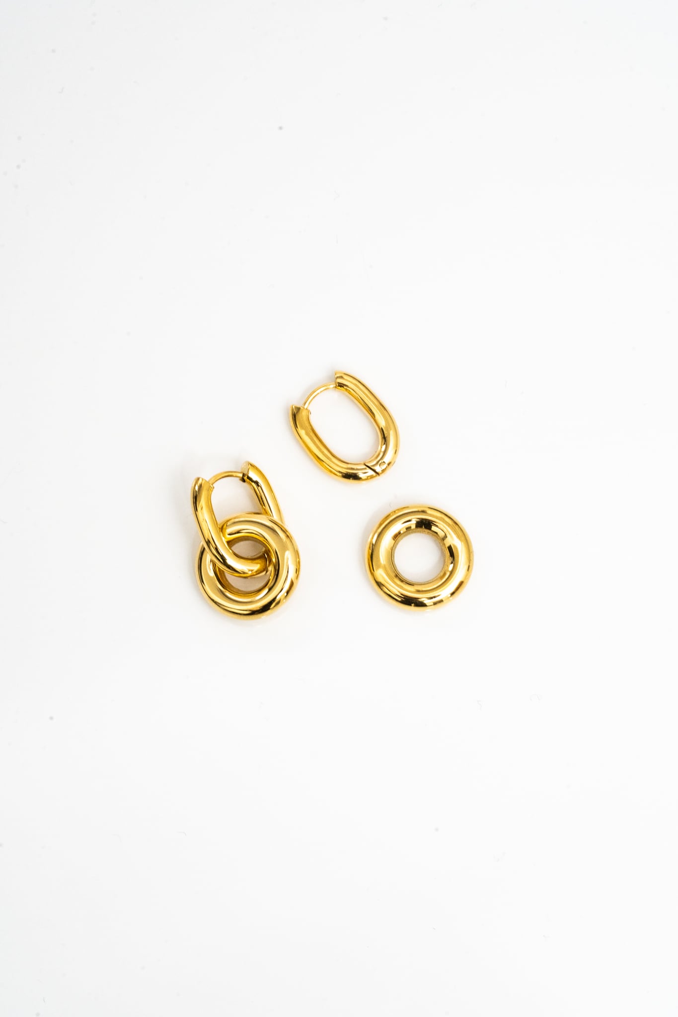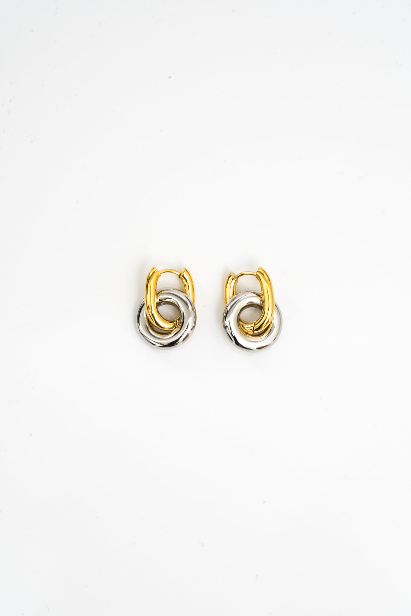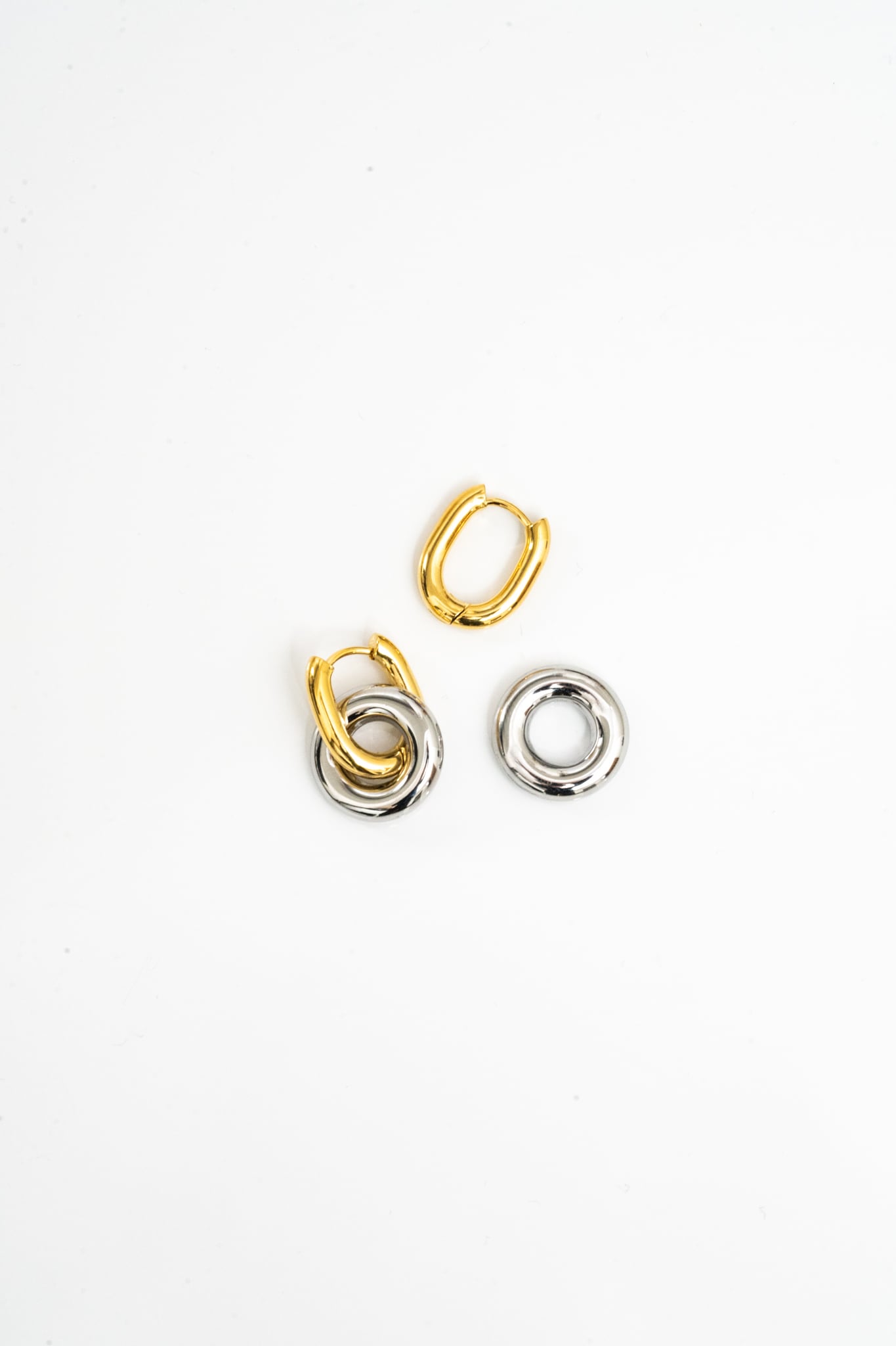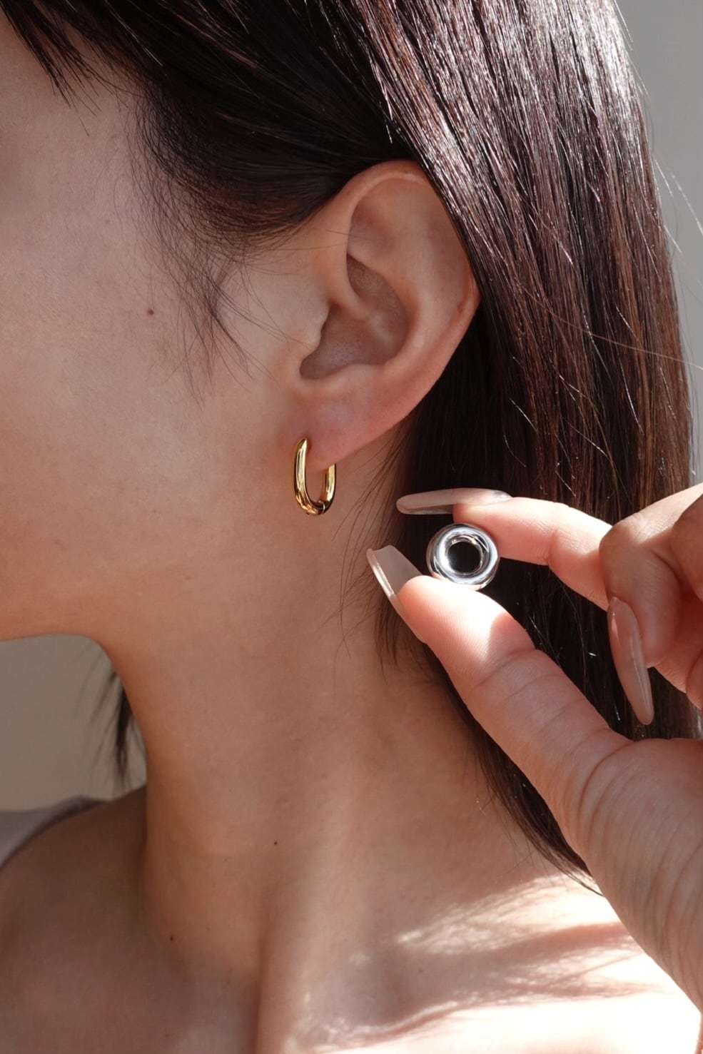 なめらかな曲線のゴールドフープに、モダンなリングモチーフをプラス。