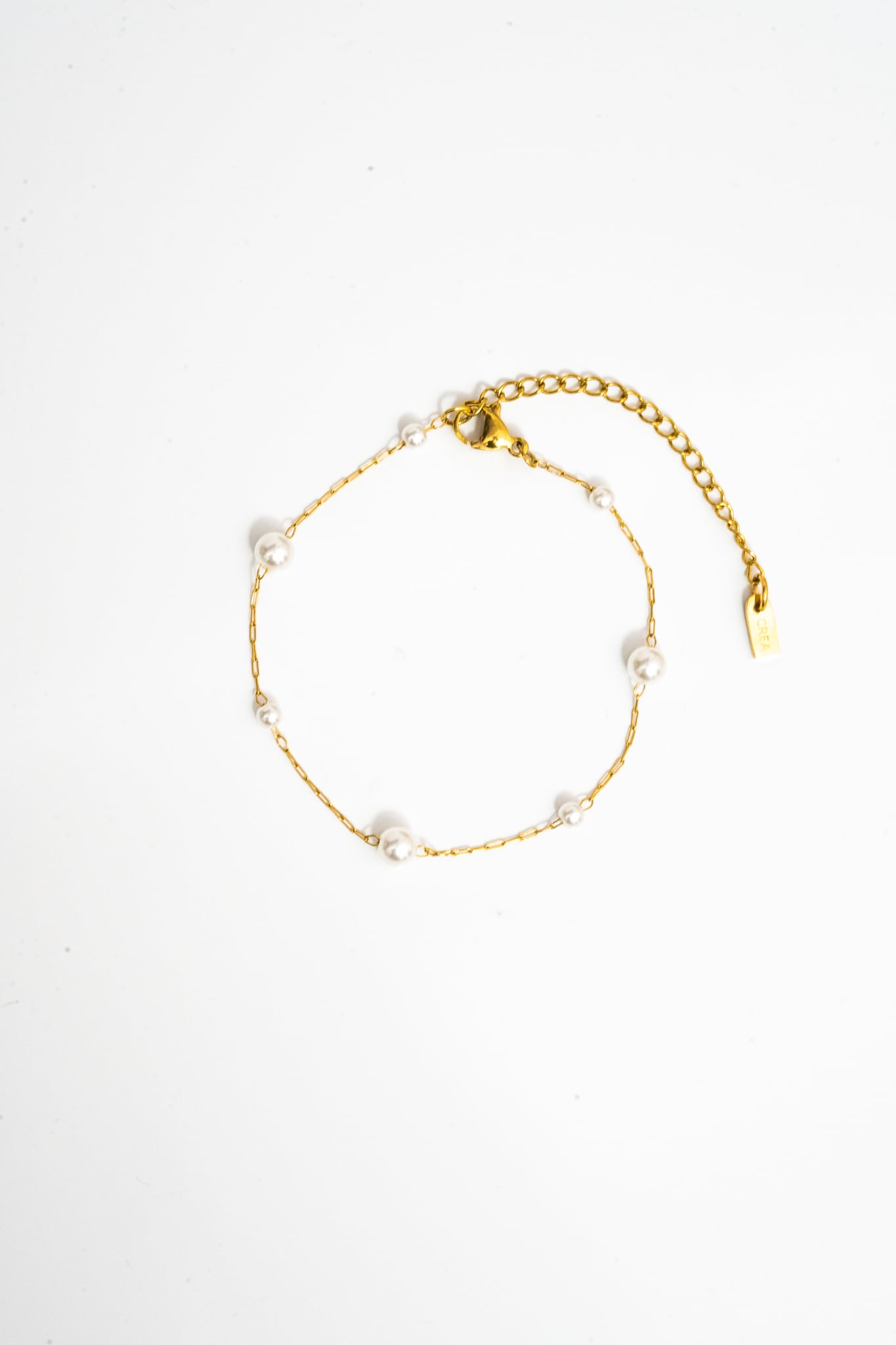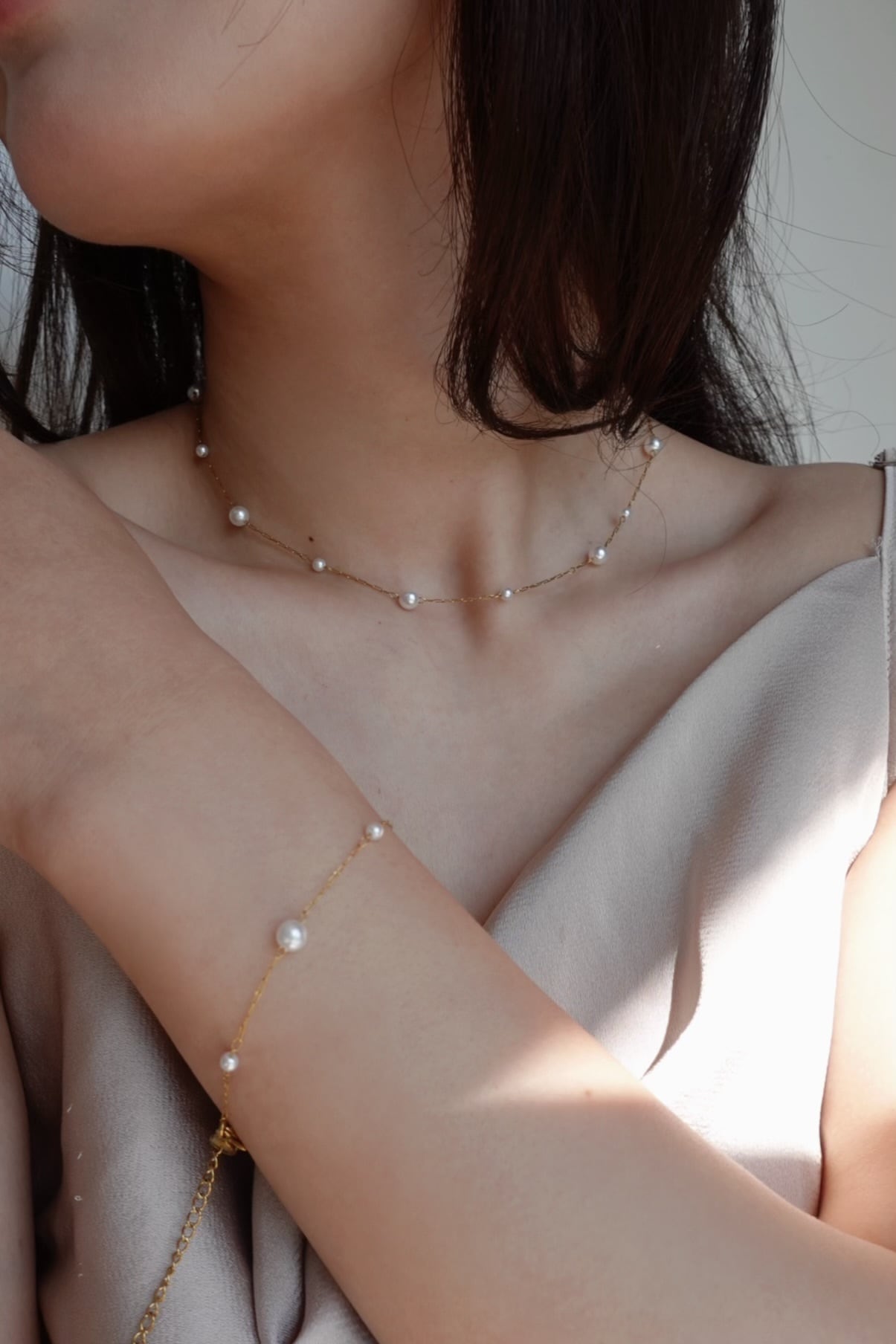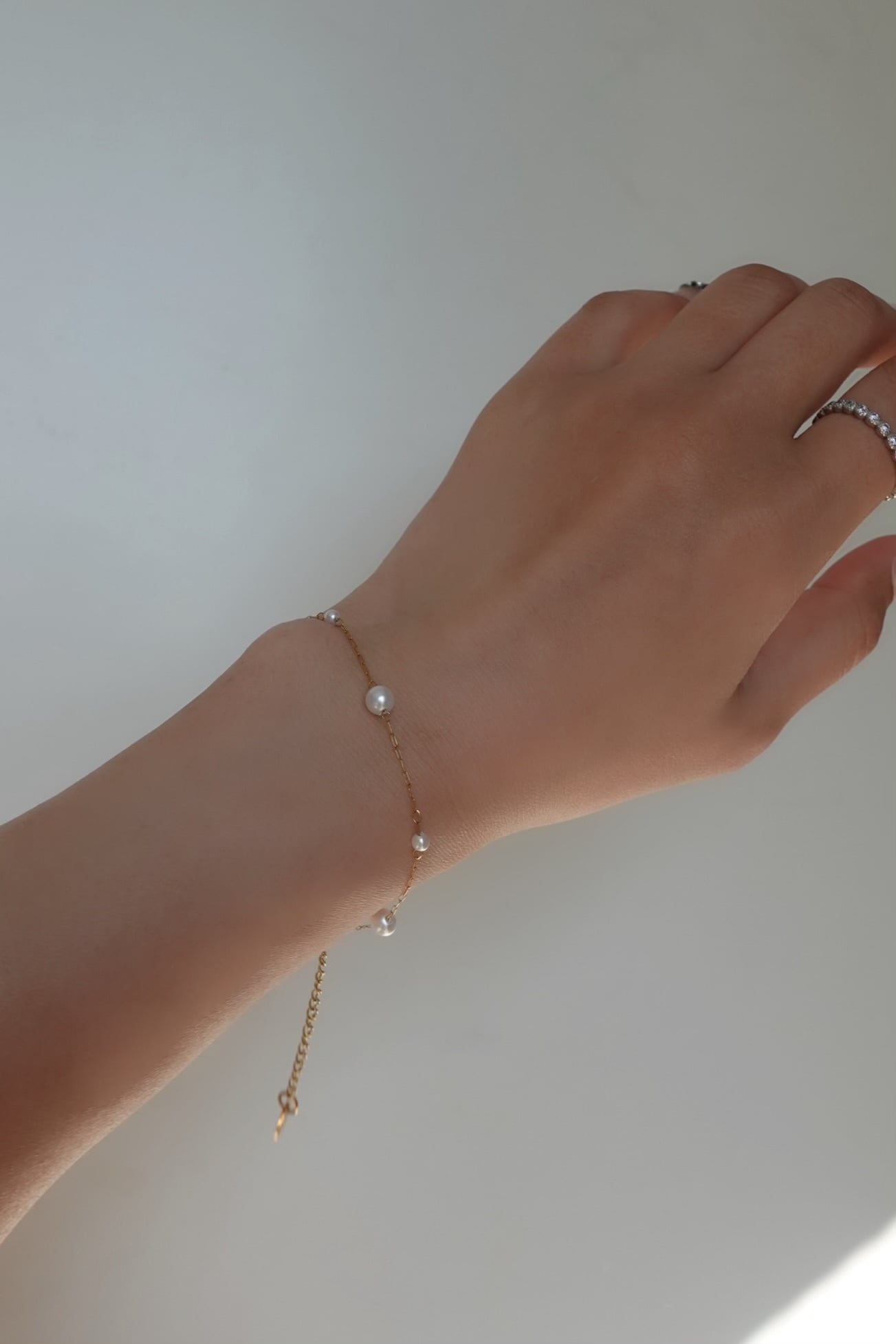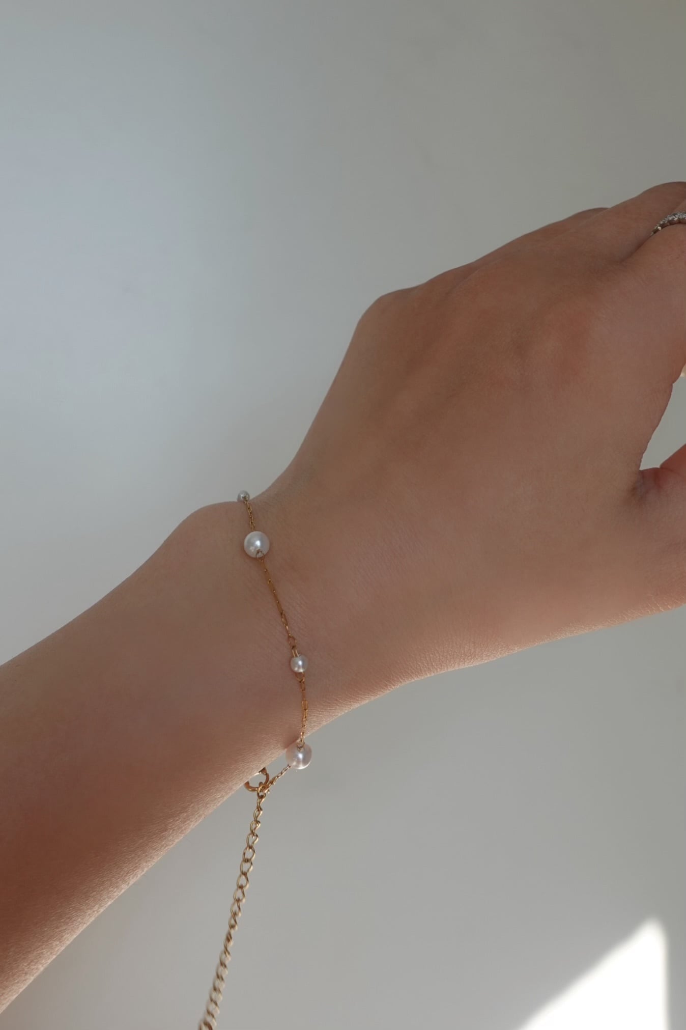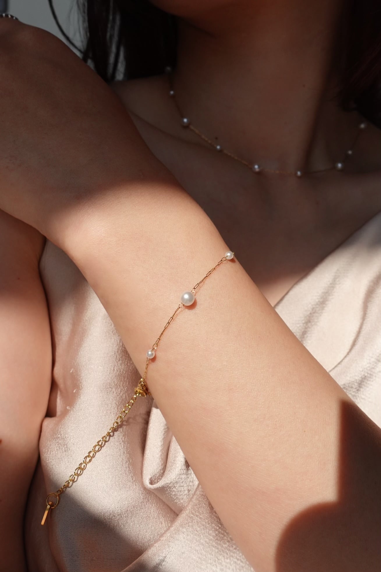繊細なゴールドチェーンに、上品な艶を放つパールを等間隔にあしらったブレスレット。