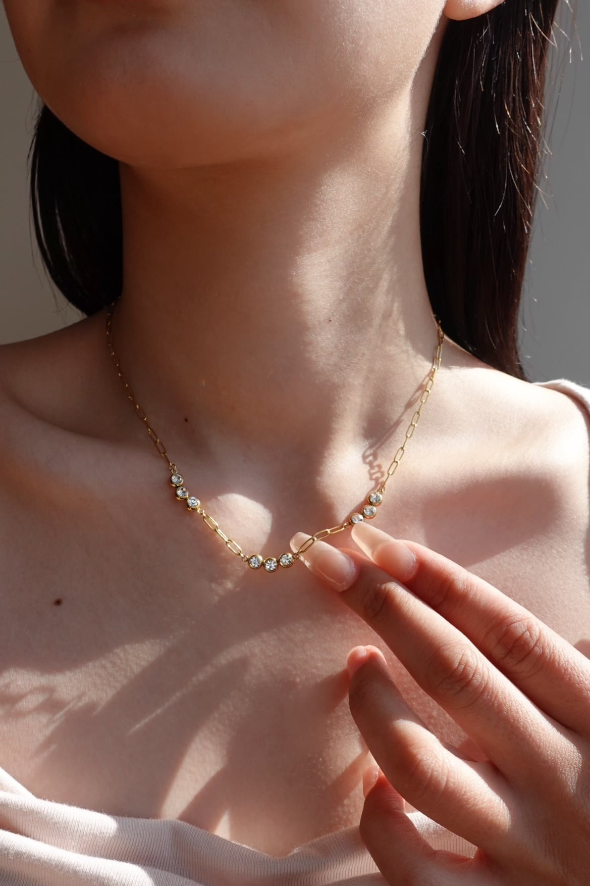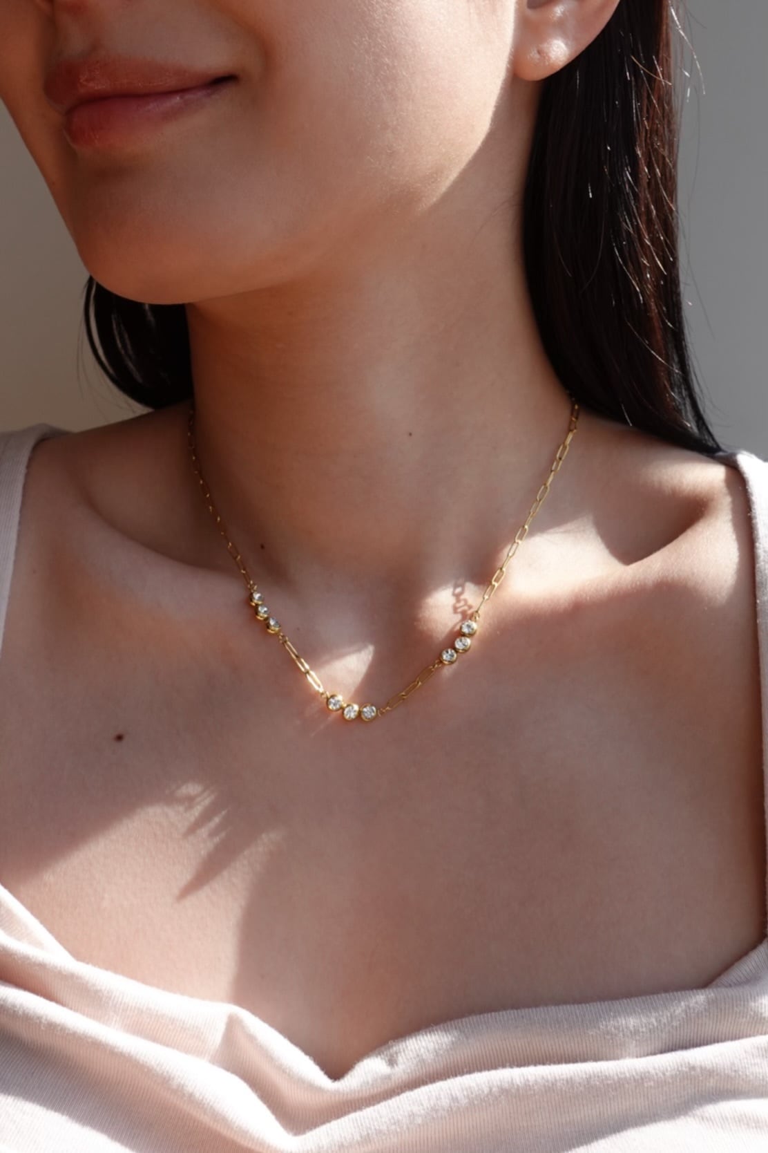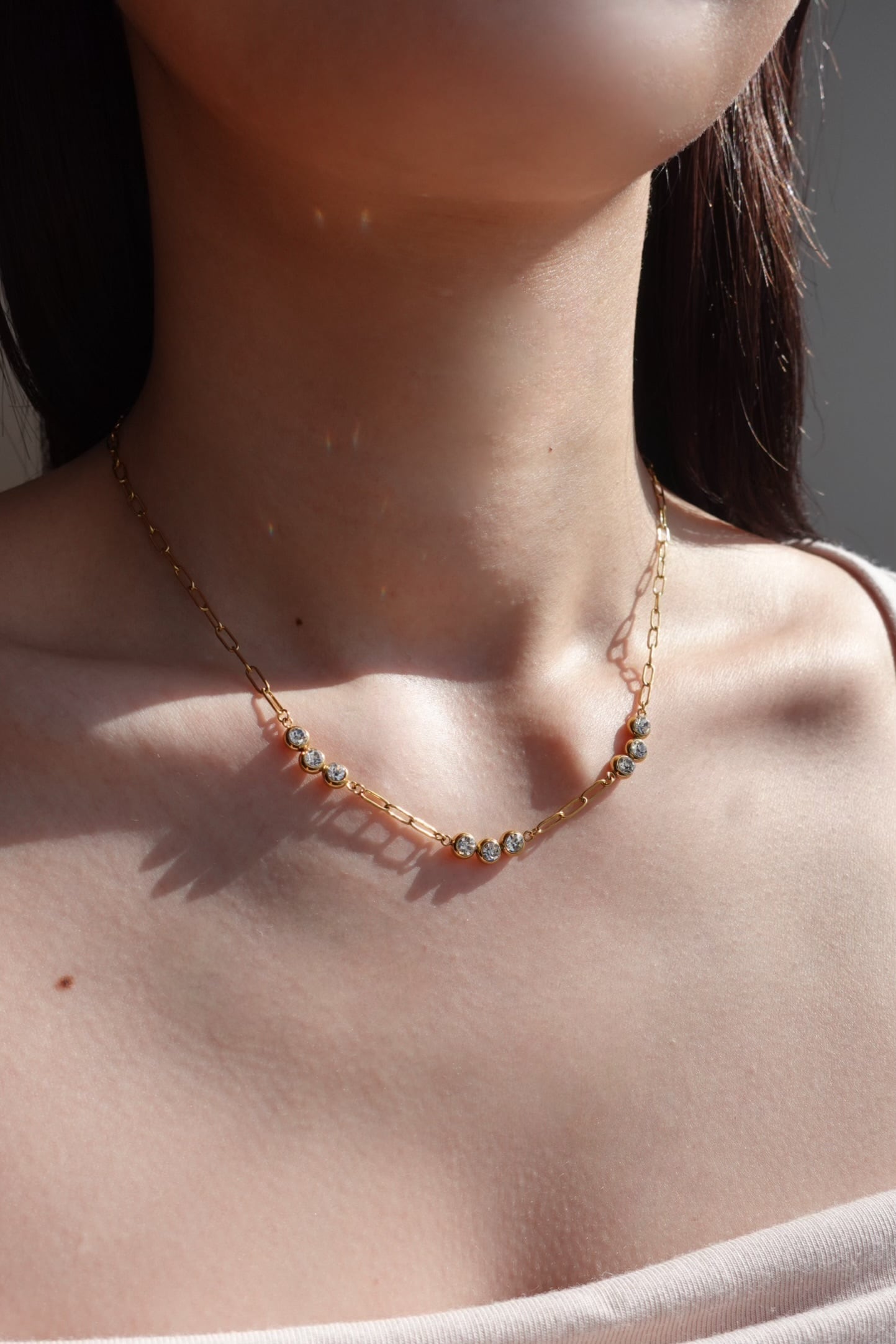 繊細なゴールドチェーンに、光を受けてきらめくストーンをリズミカルにセッティング。胸元にやさしいカーブを描くデザインが、まるで雫のような透明感と軽やかさを演出します。