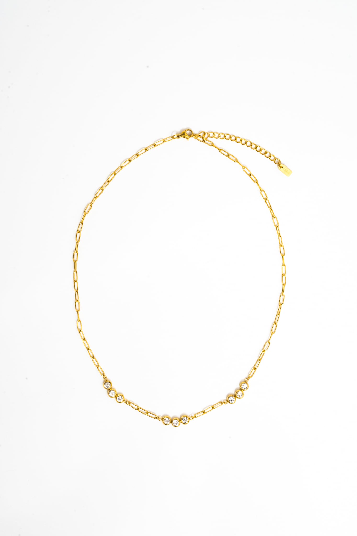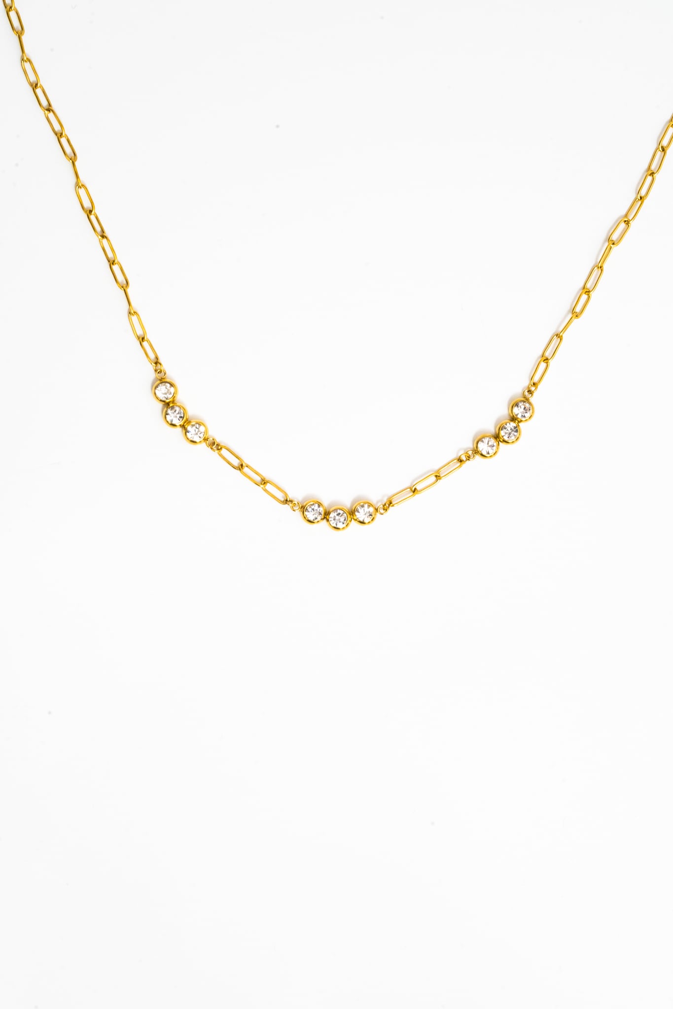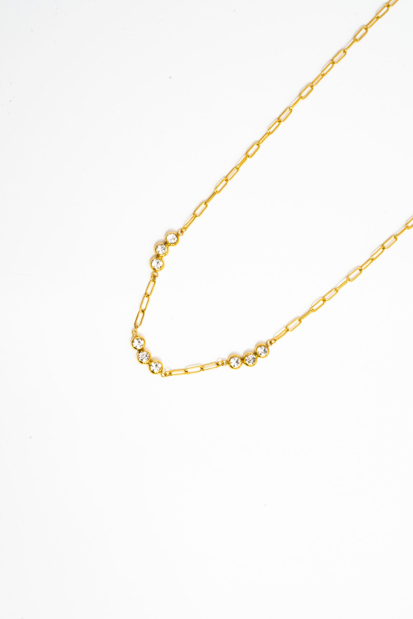 繊細なゴールドチェーンに、光を受けてきらめくストーンをリズミカルにセッティング。胸元にやさしいカーブを描くデザインが、まるで雫のような透明感と軽やかさを演出します。