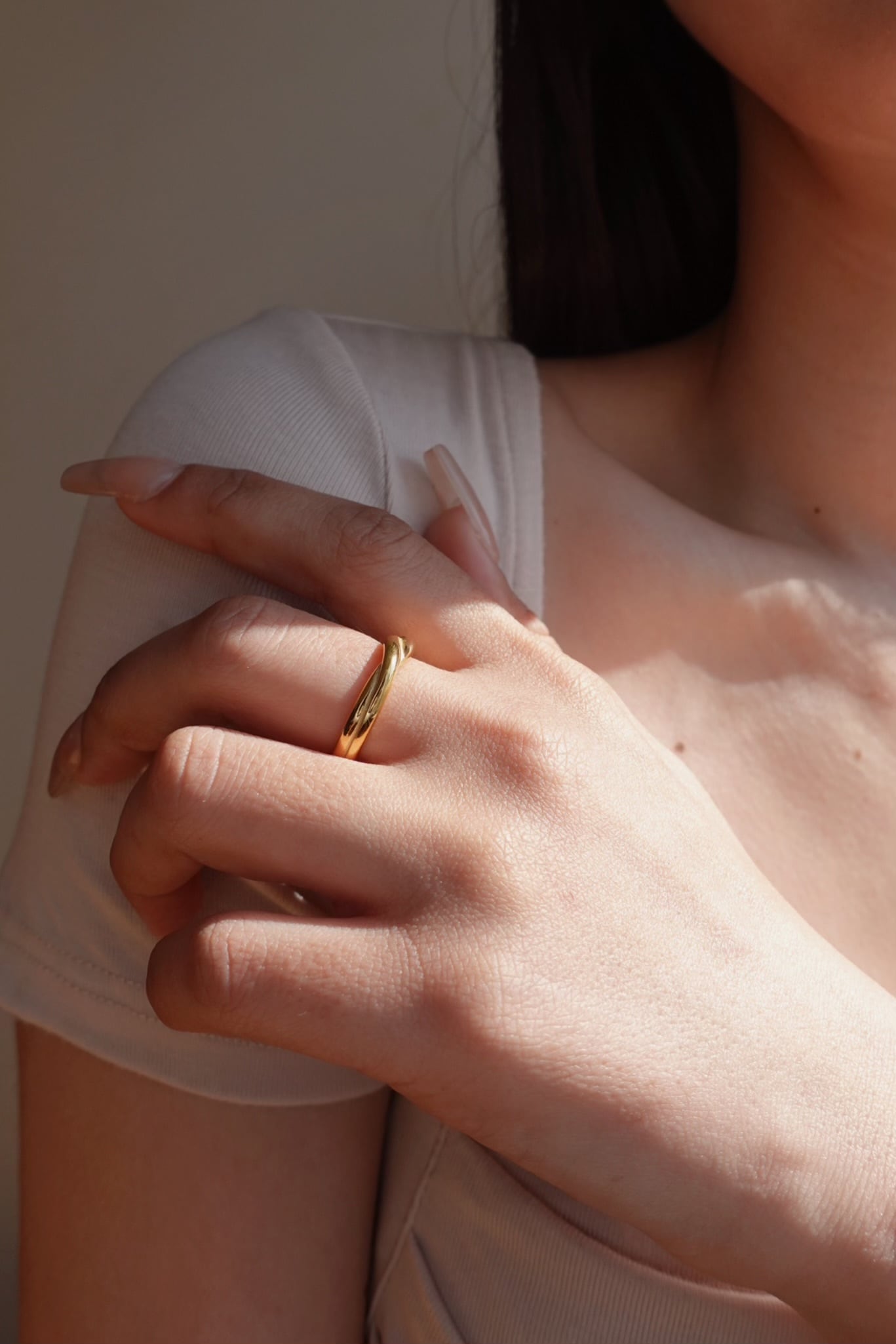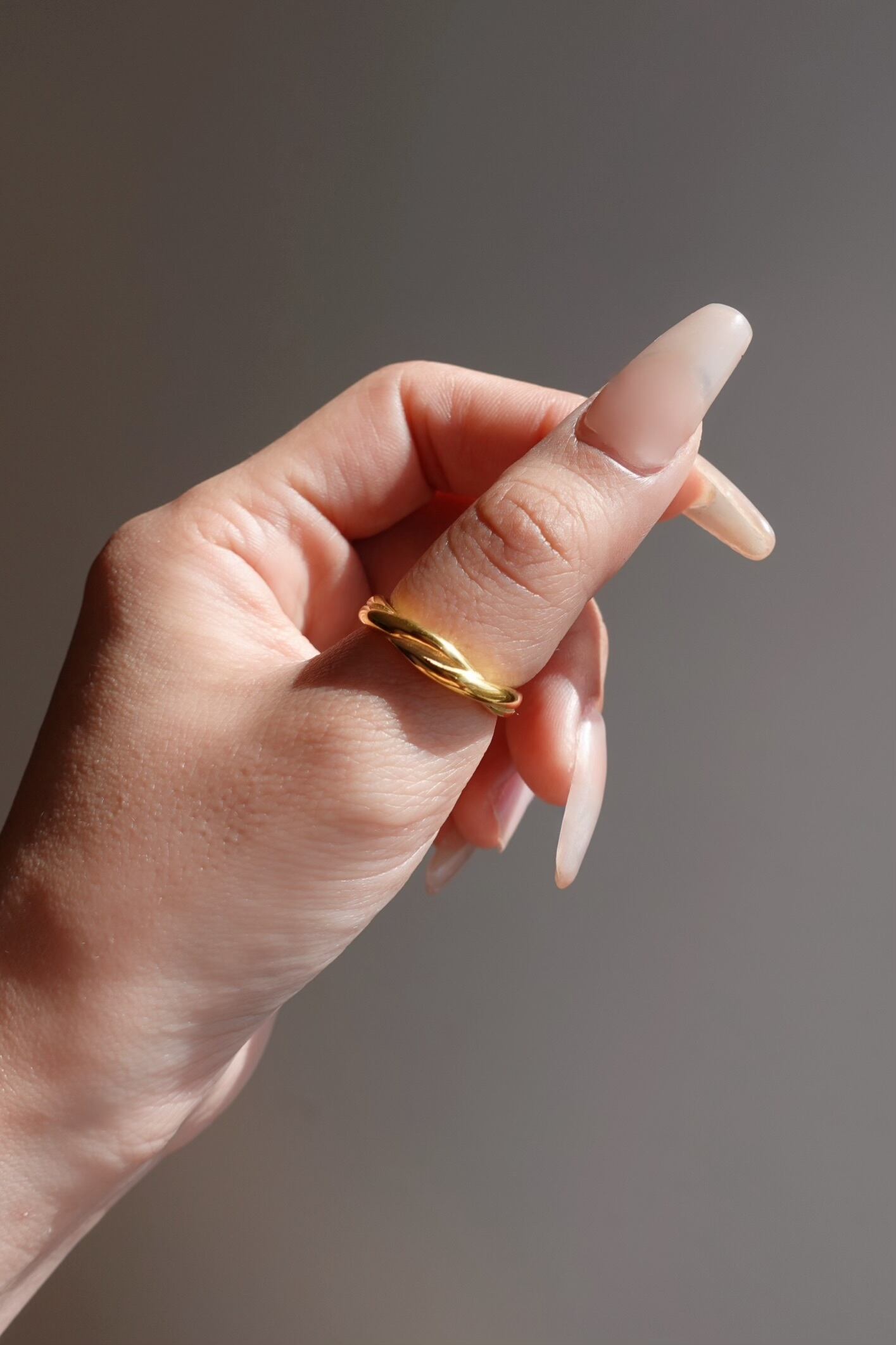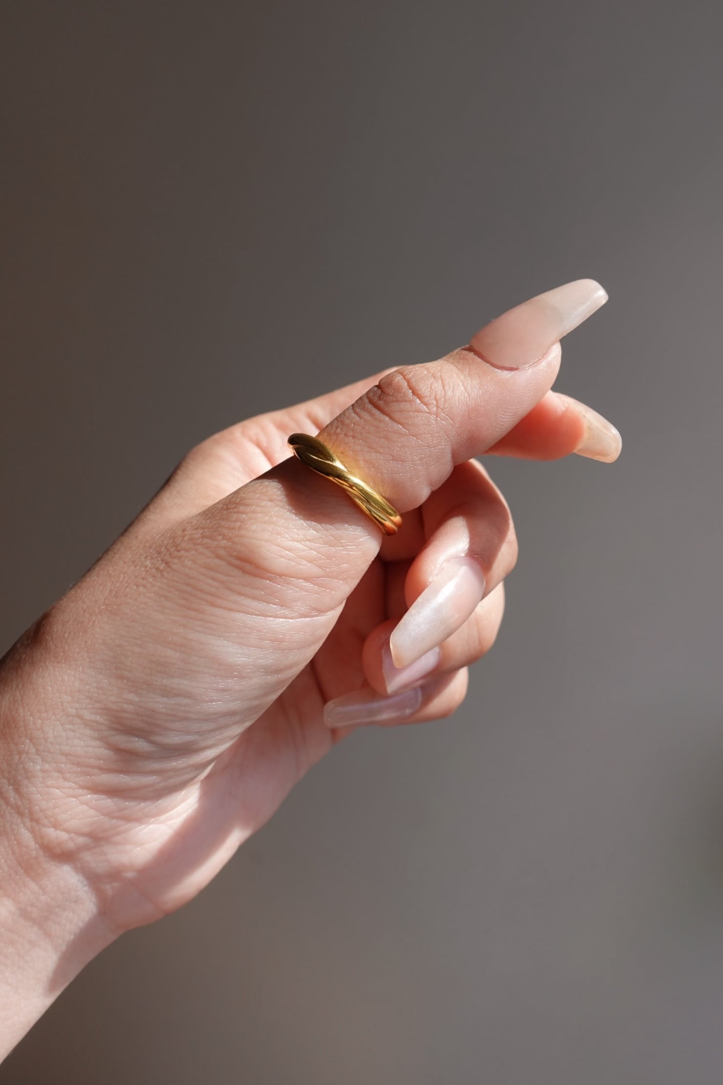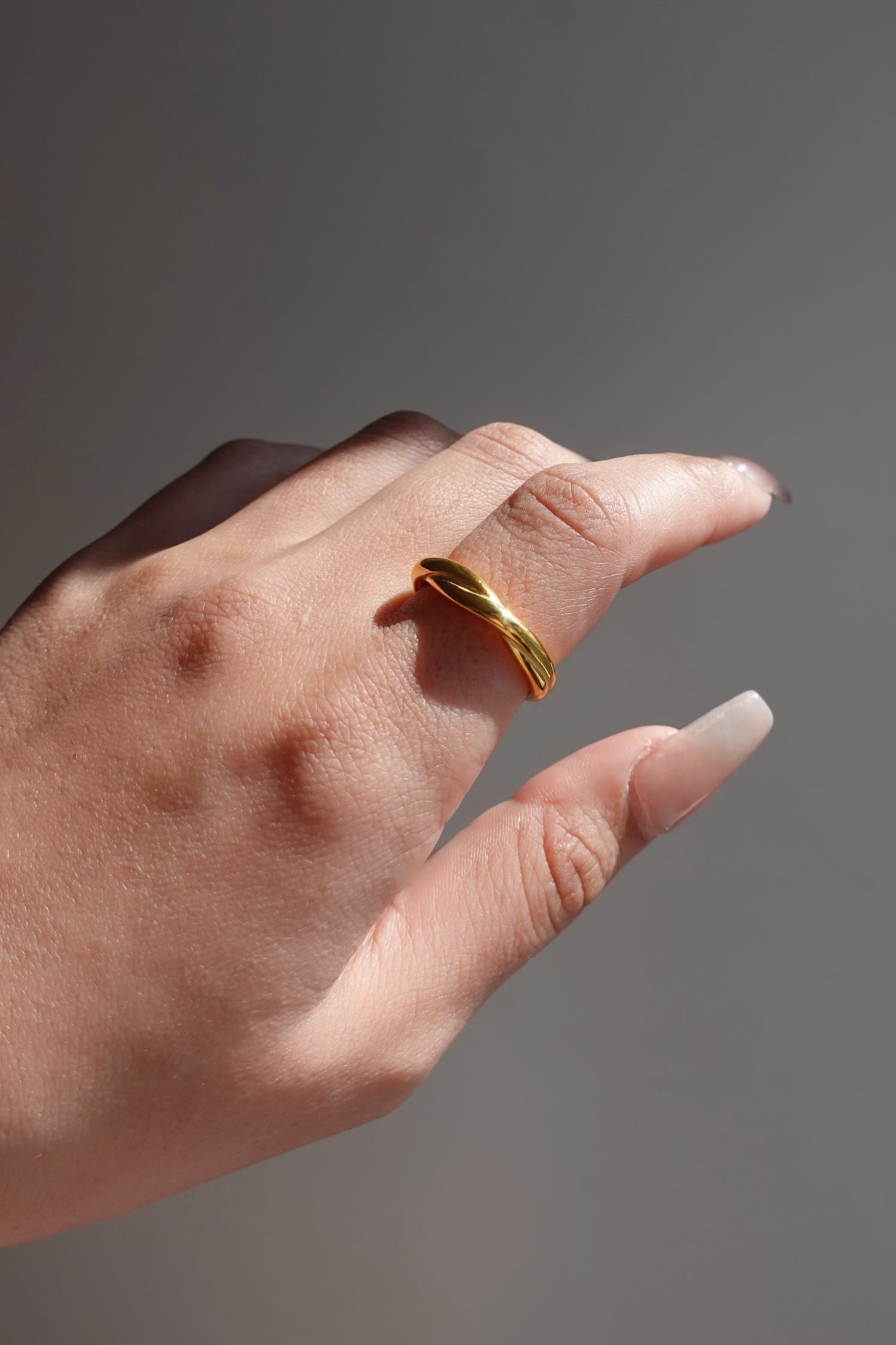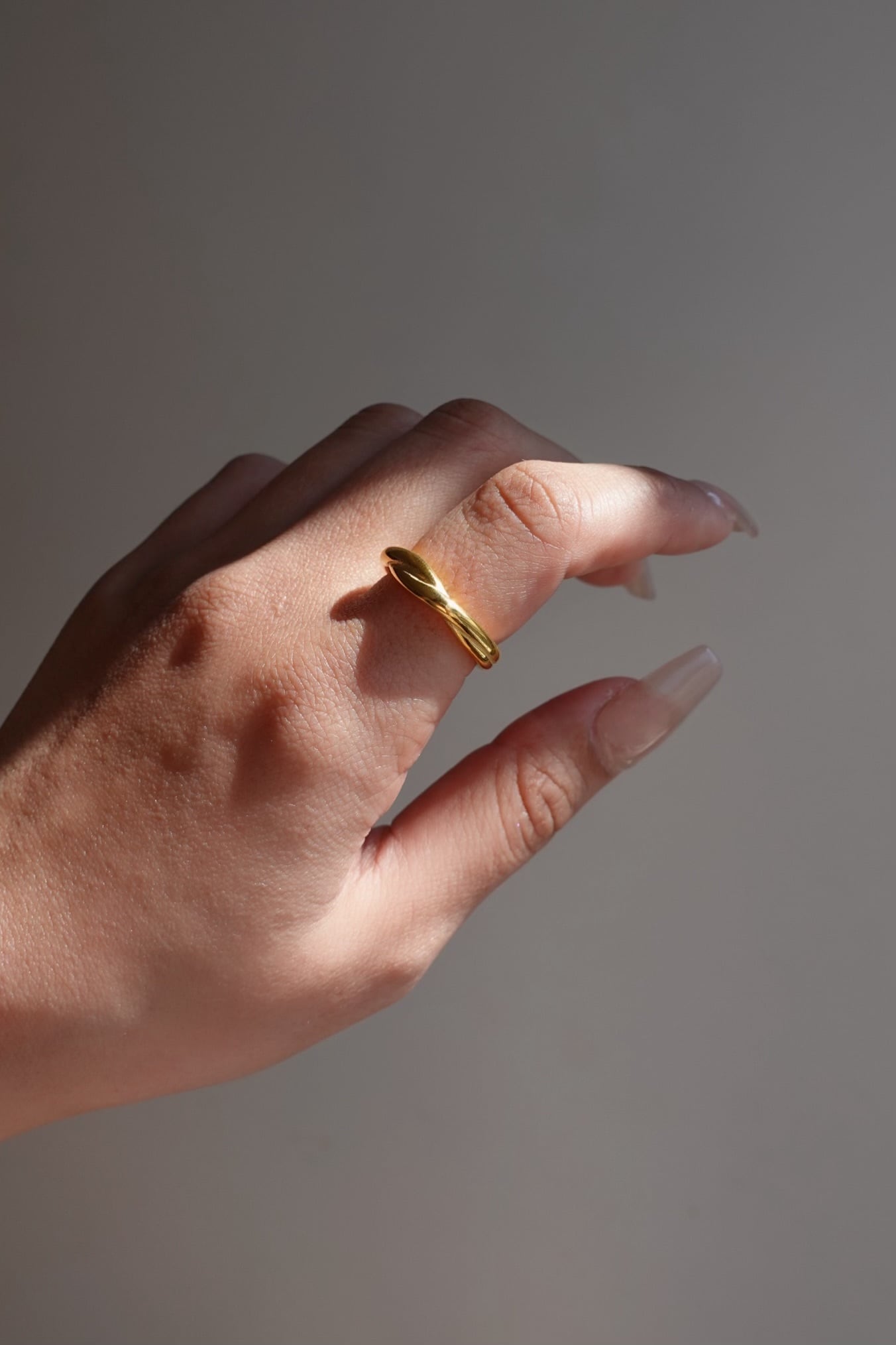 シンプルでありながら、交差するラインが指先にさりげない動きを与え、角度によって異なる表情を楽しめます。