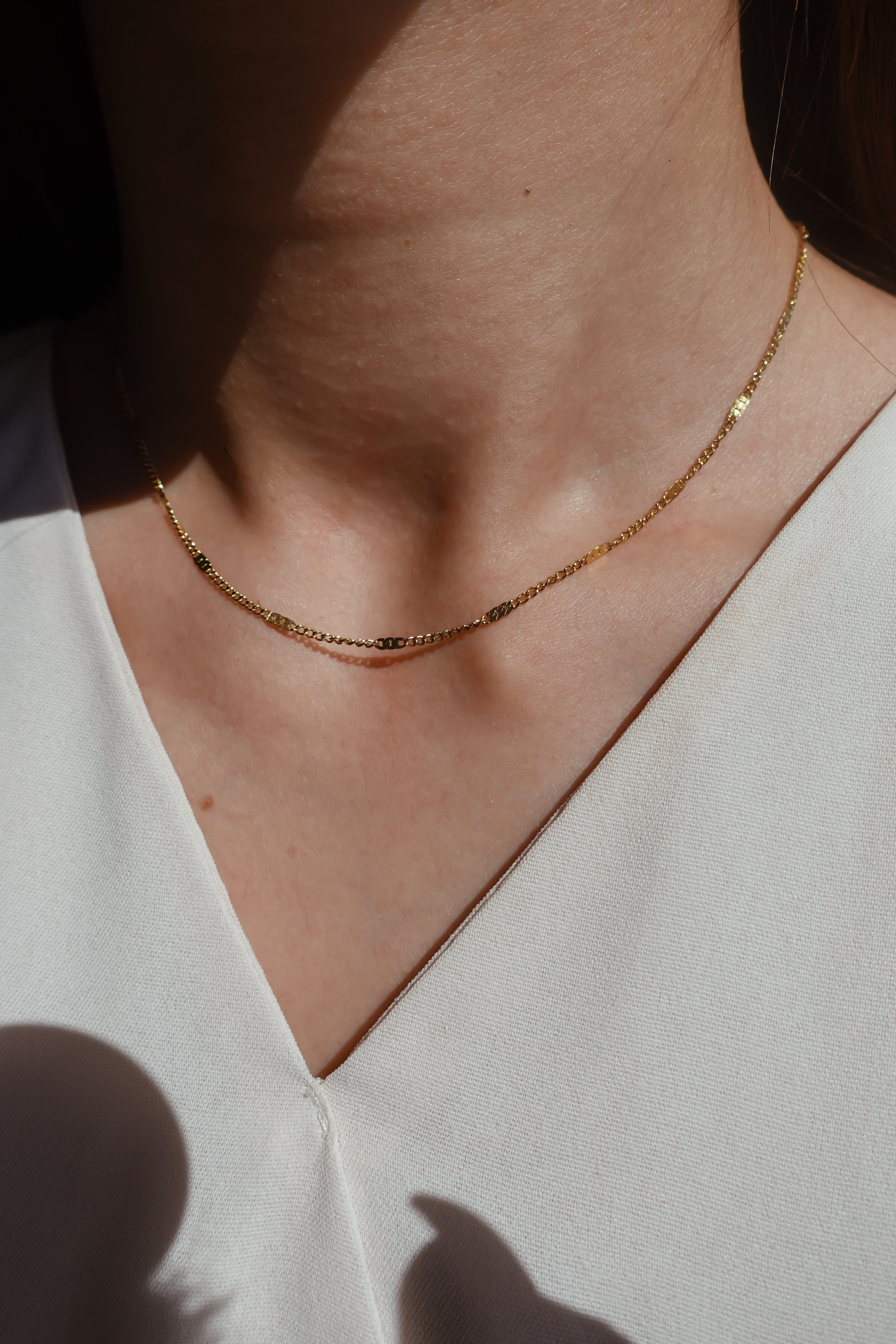 定番の喜平チェーンに等間隔に潰し加工を加え、シンプルすぎない程よいアクセントのあるネックレスに仕上げました。細身の喜平チェーンでアジャスターもついているため普段使いにも最適のアイテムです。