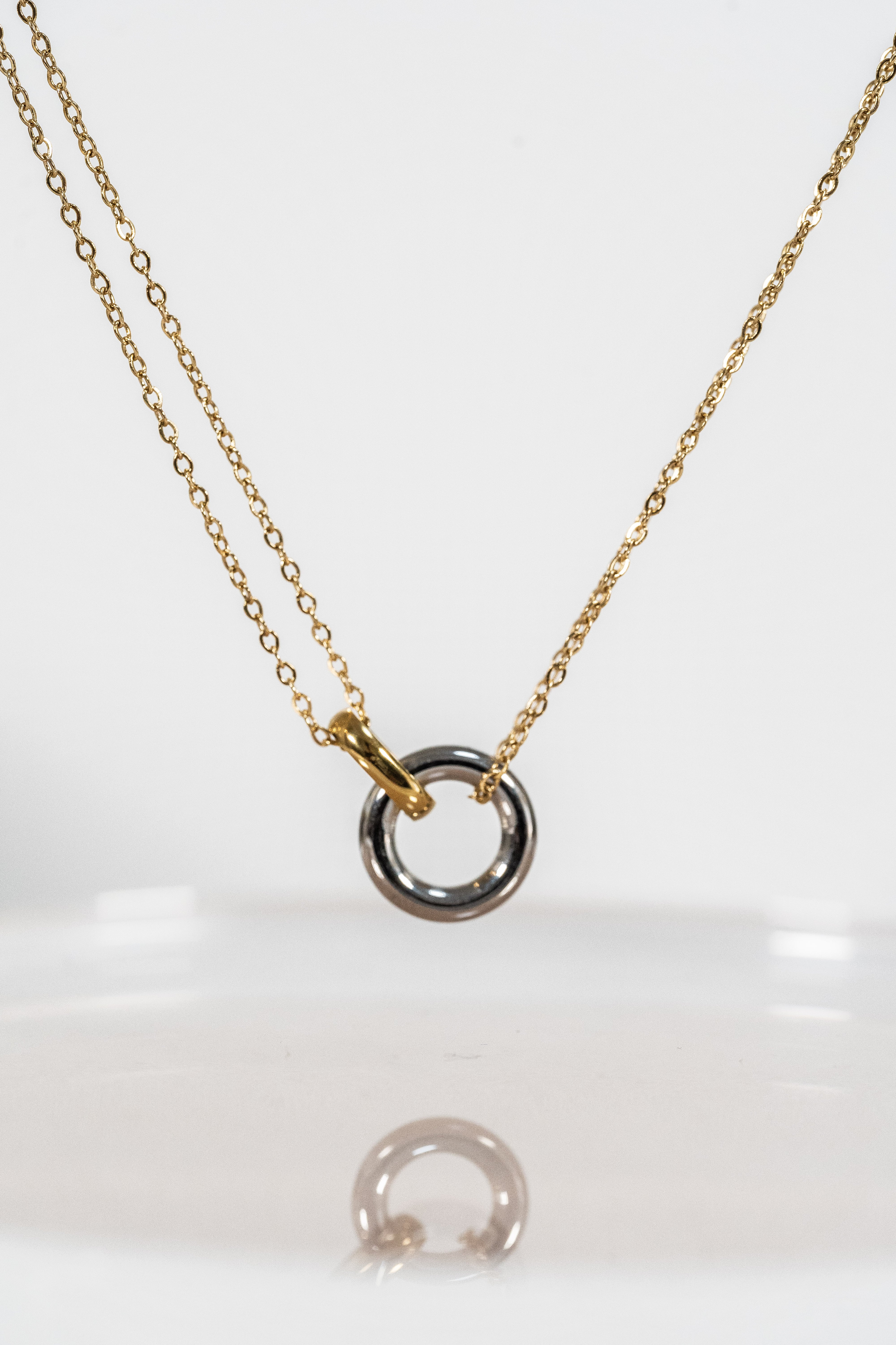 2つの異なったリング上のペンダントを組み合わせたネックレス。サイズ調節可能で長めにも着用できるため短めのシンプルなチェーンネックレスとも相性のいいアイテムです。
