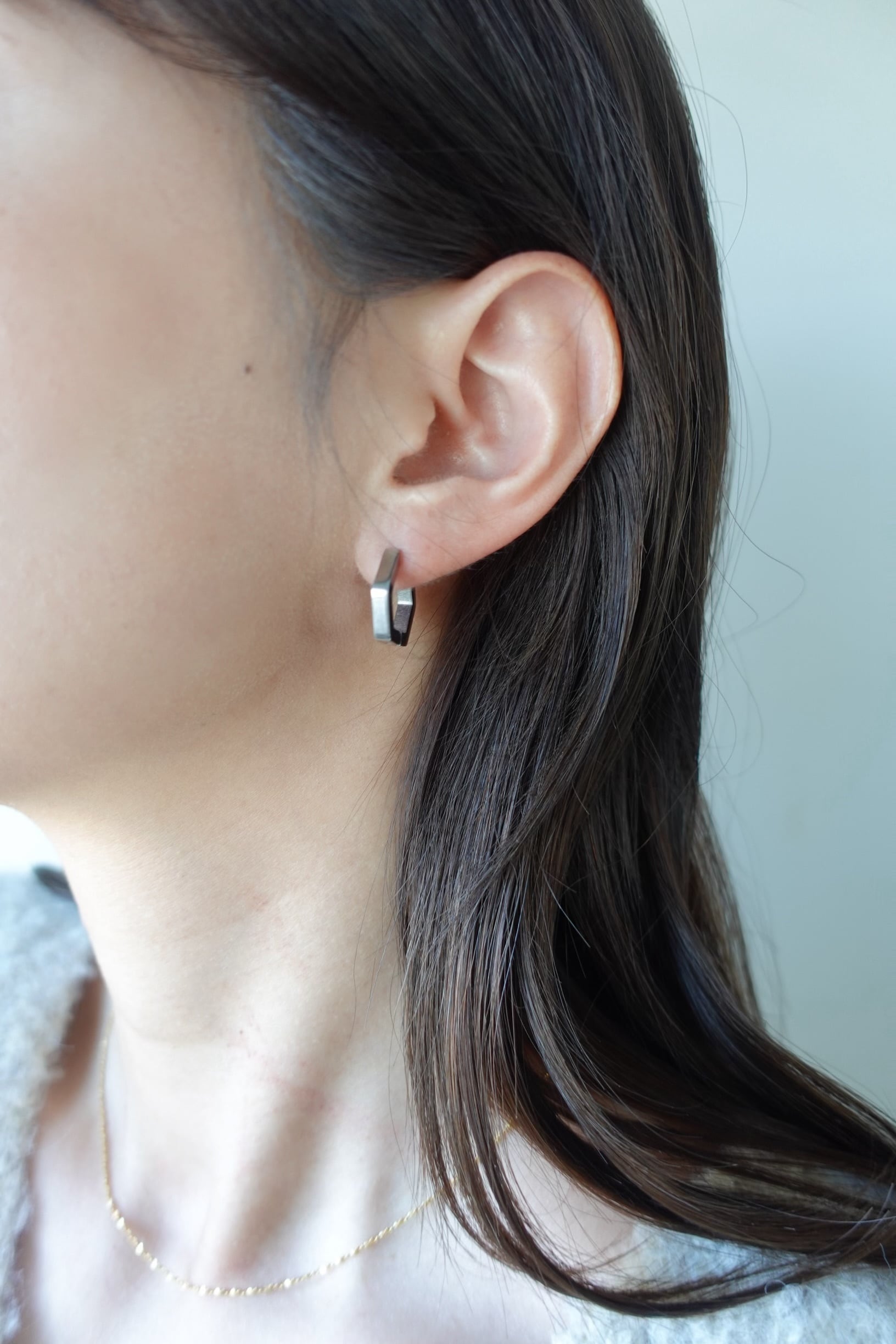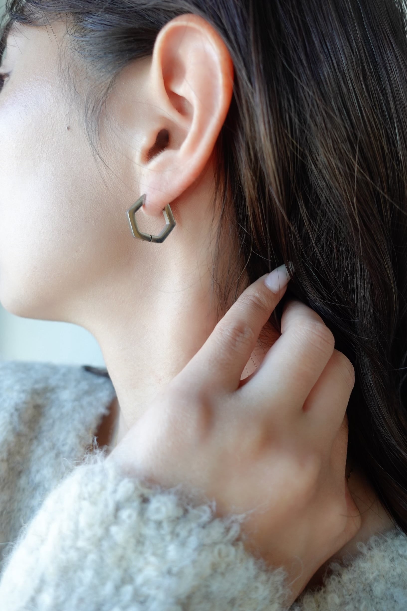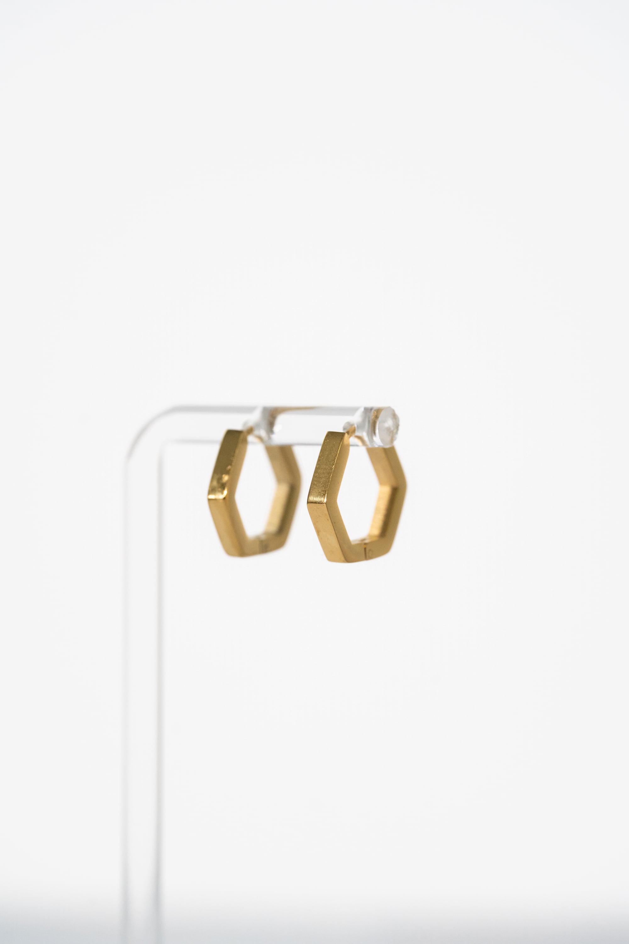 6角形のシンプルなフープピアス。キャッチレスでご使用いただけるピアスです。