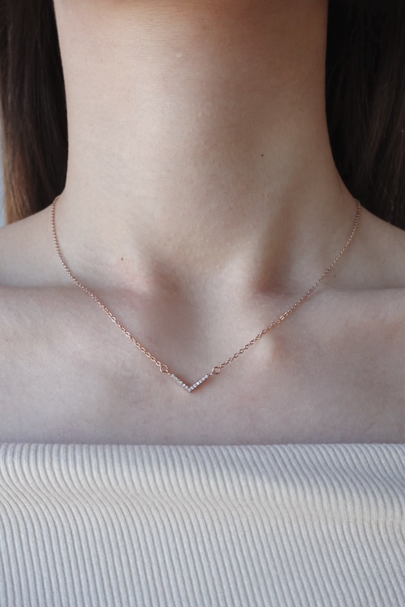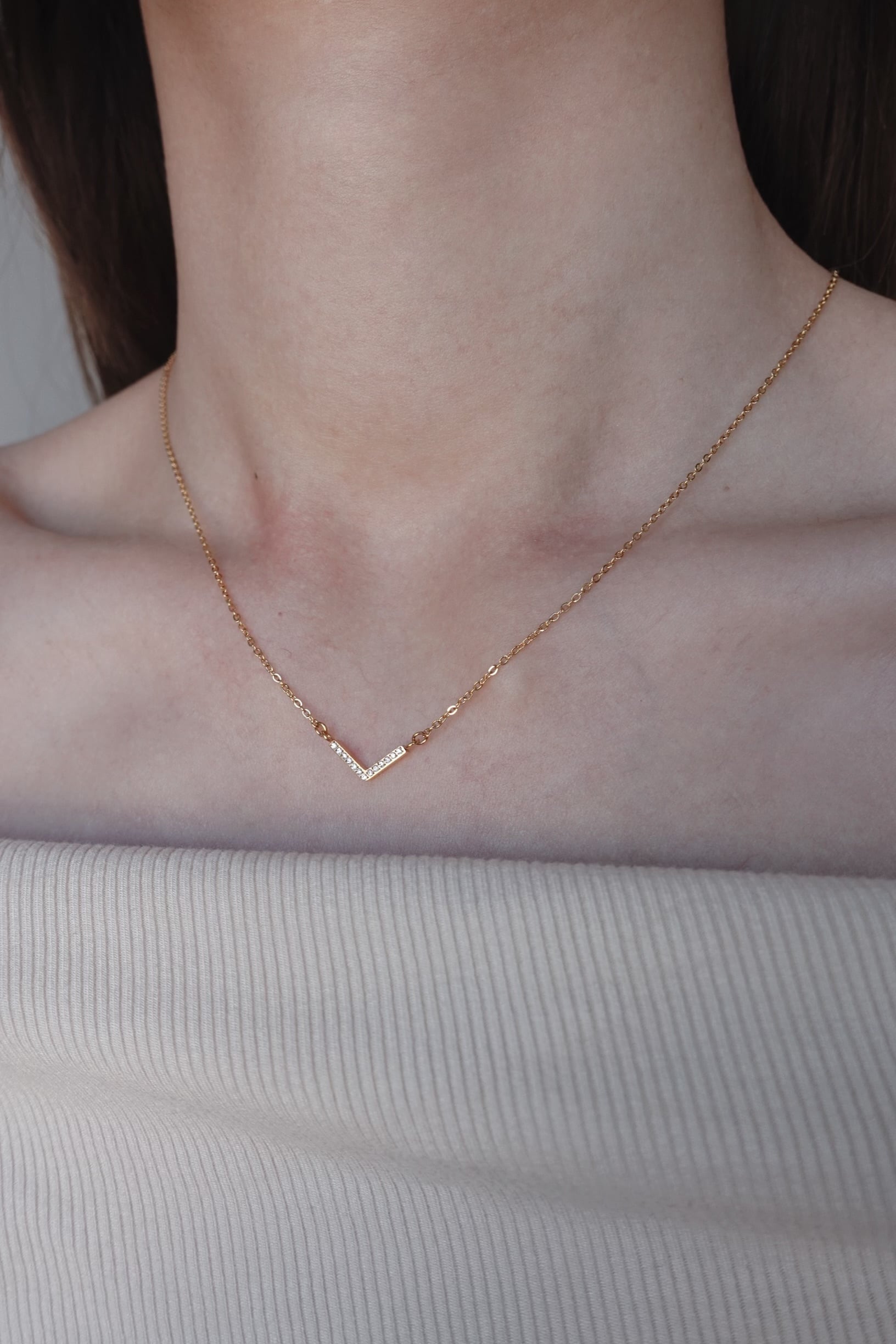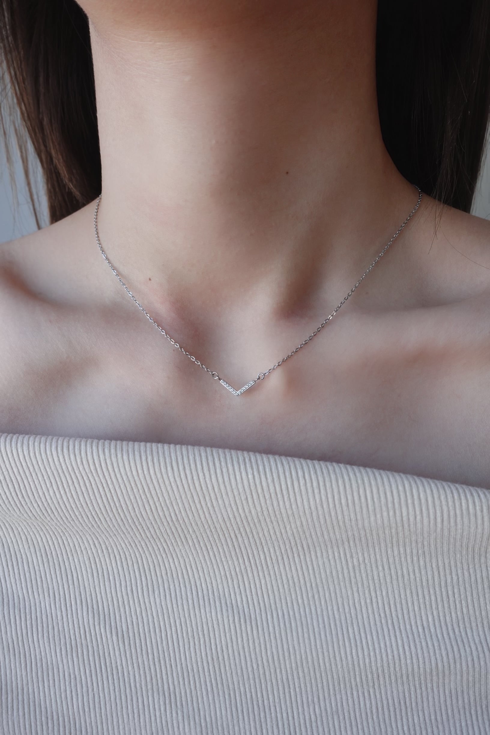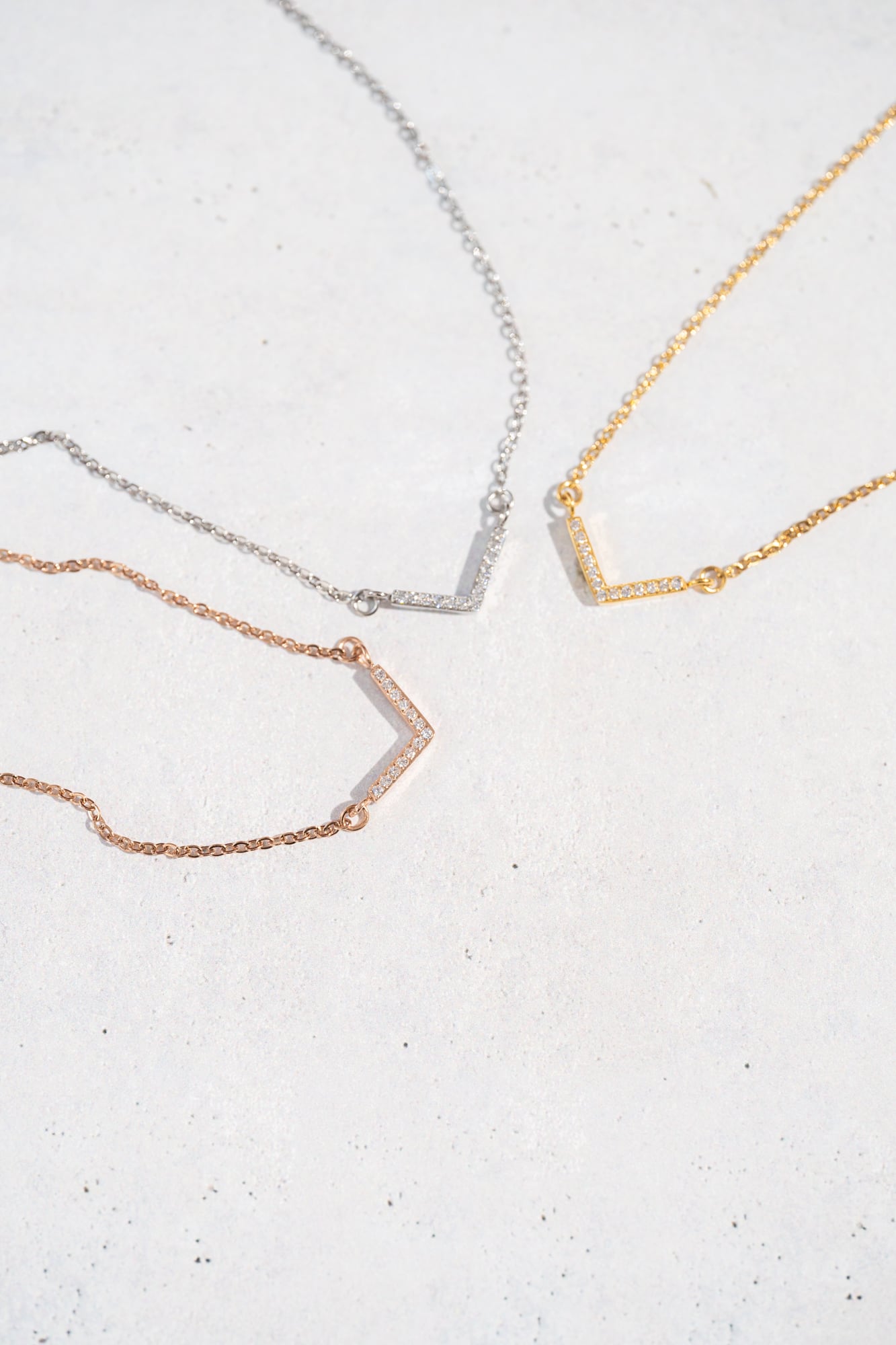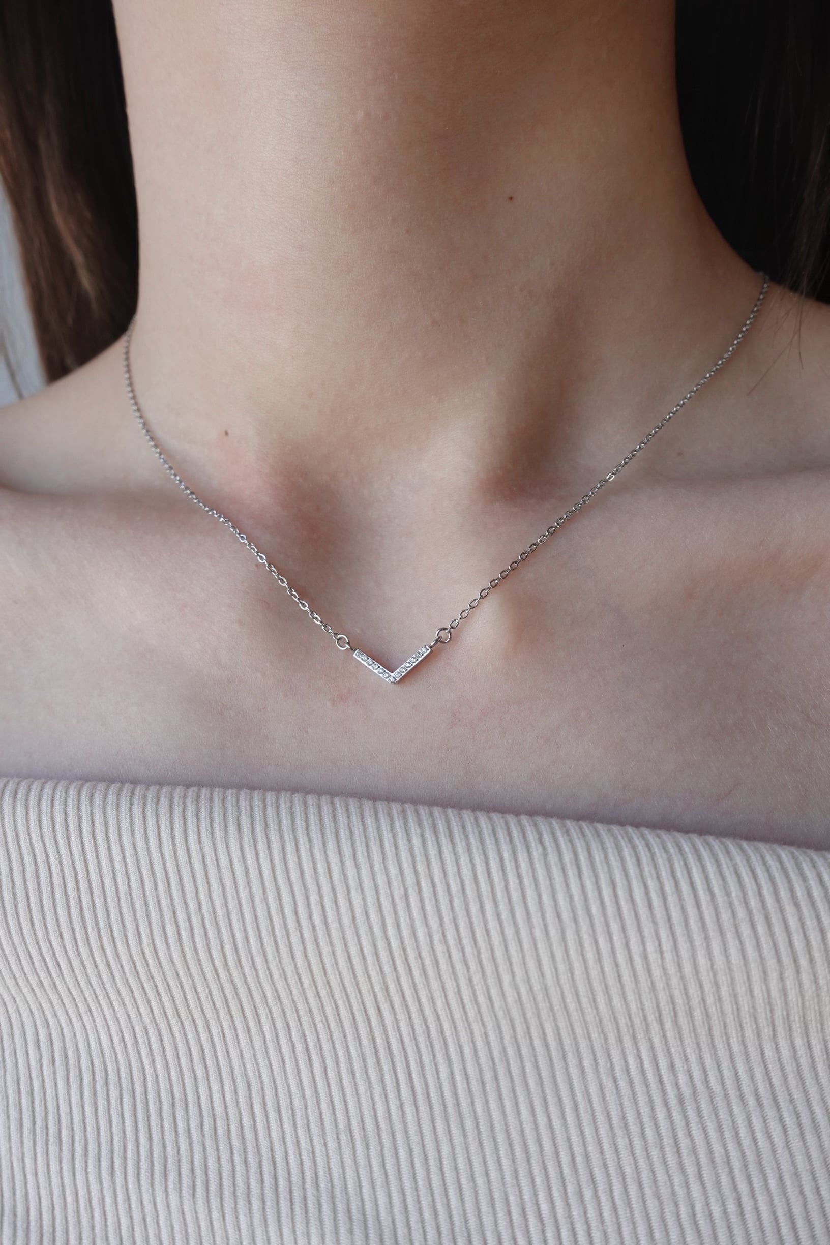 上品なサイズ感で設計したVのペンダントネックレス。モチーフ部分には細かなジルコニアダイアを施し、ミニマルかつ高級感のある仕上げに。