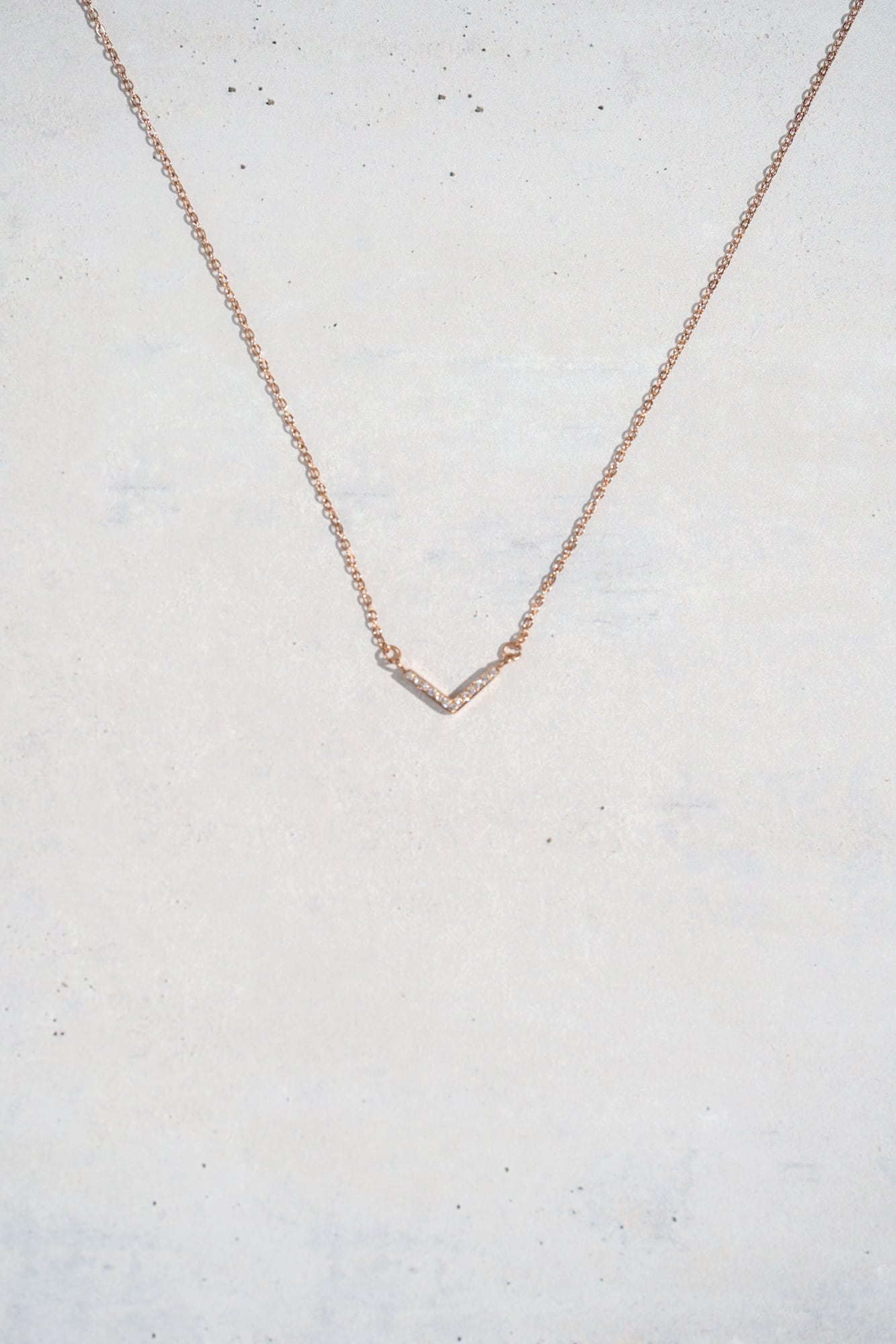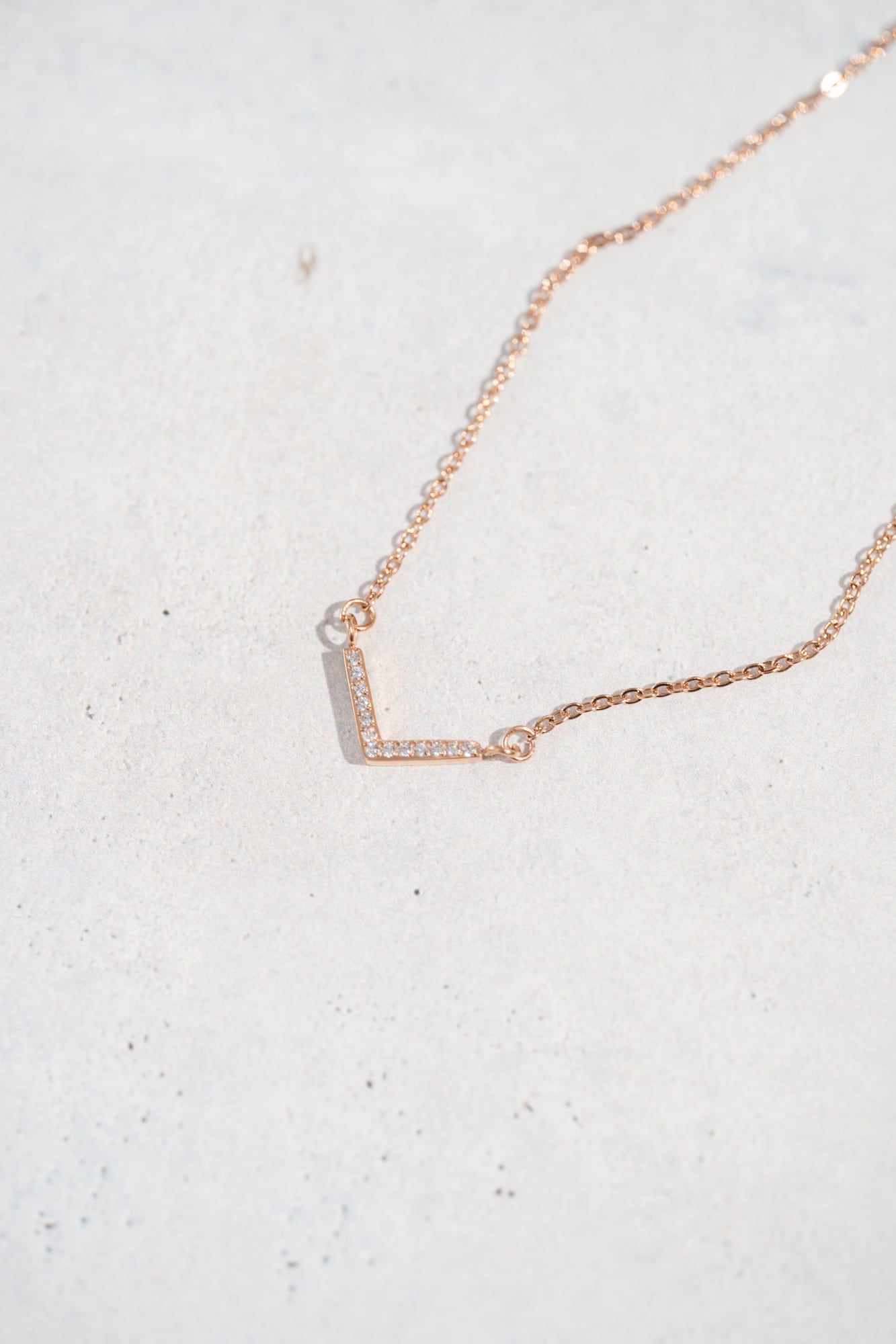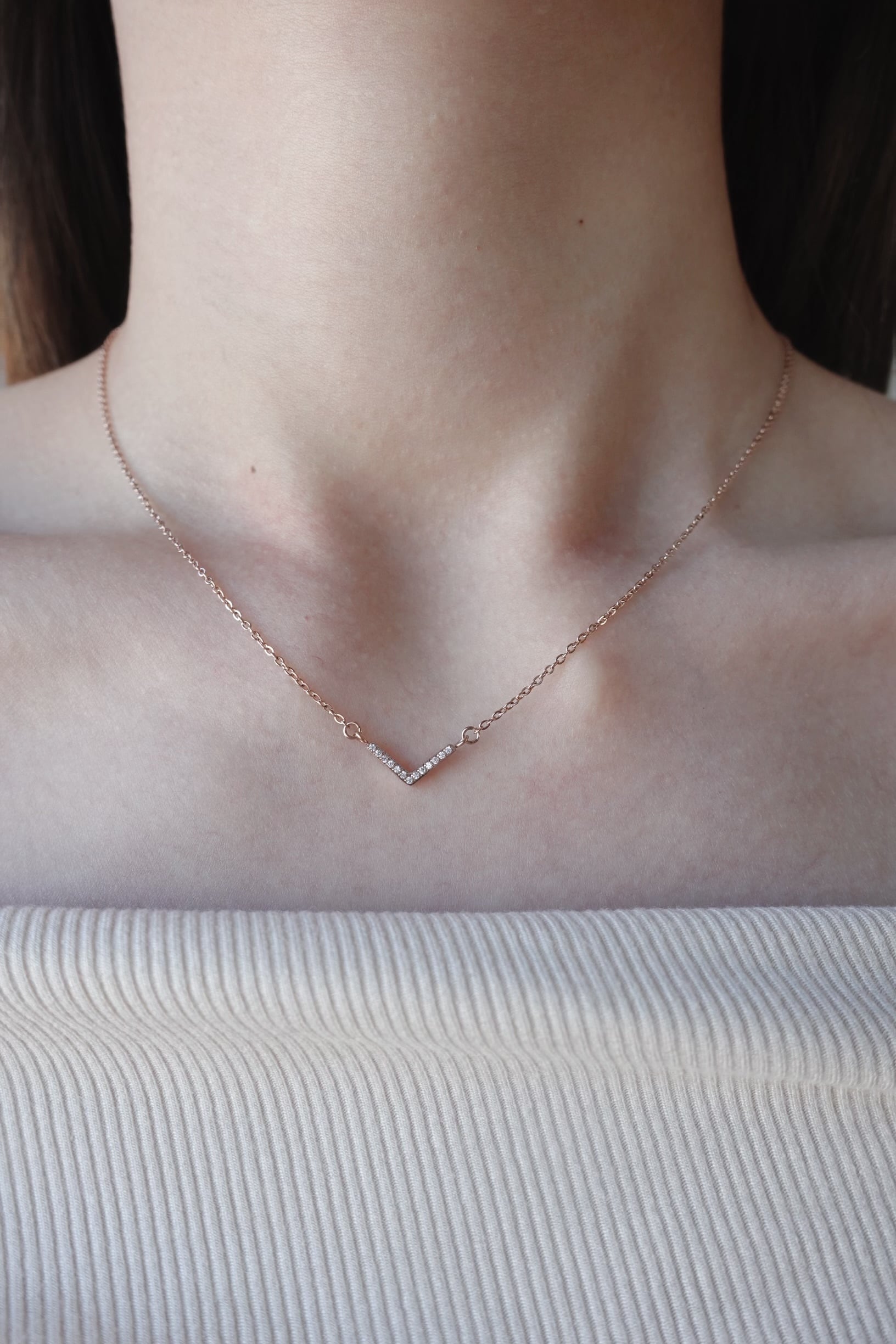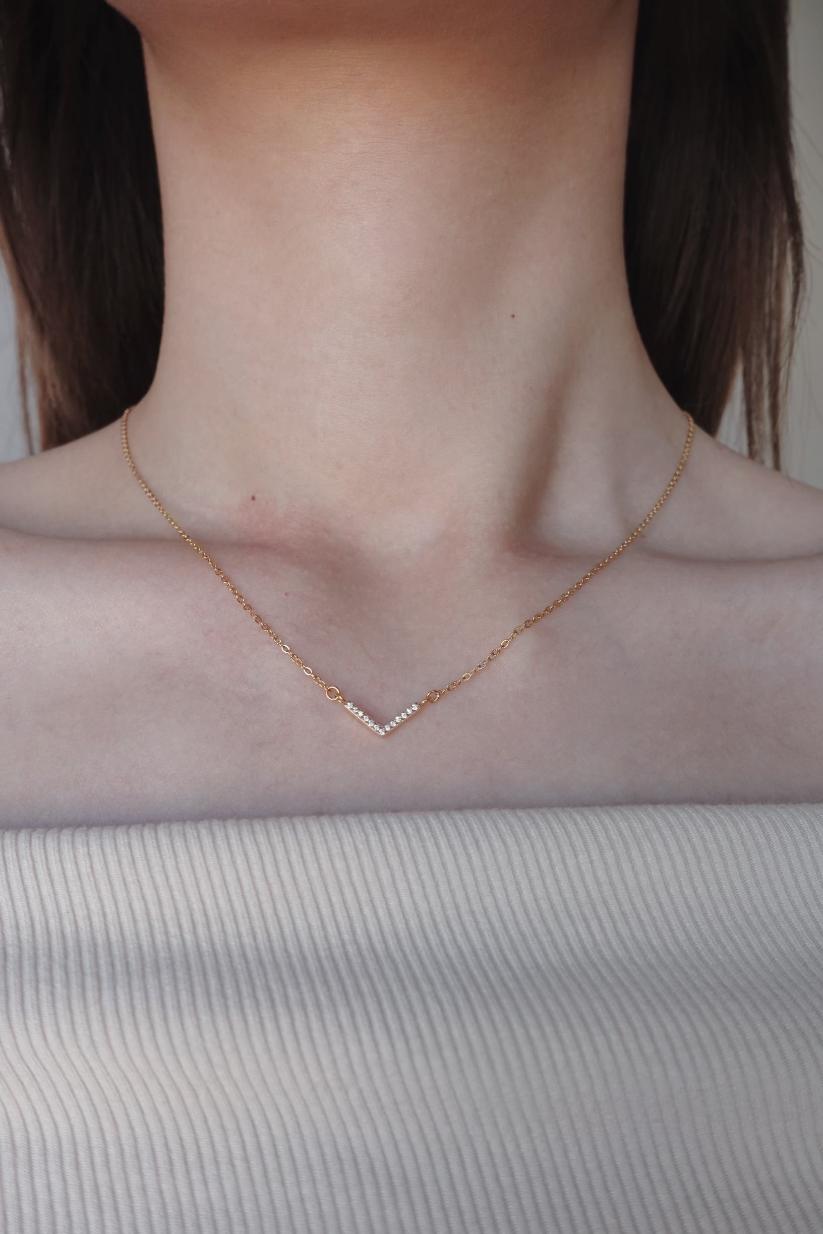 上品なサイズ感で設計したVのペンダントネックレス。モチーフ部分には細かなジルコニアダイアを施し、ミニマルかつ高級感のある仕上げに。