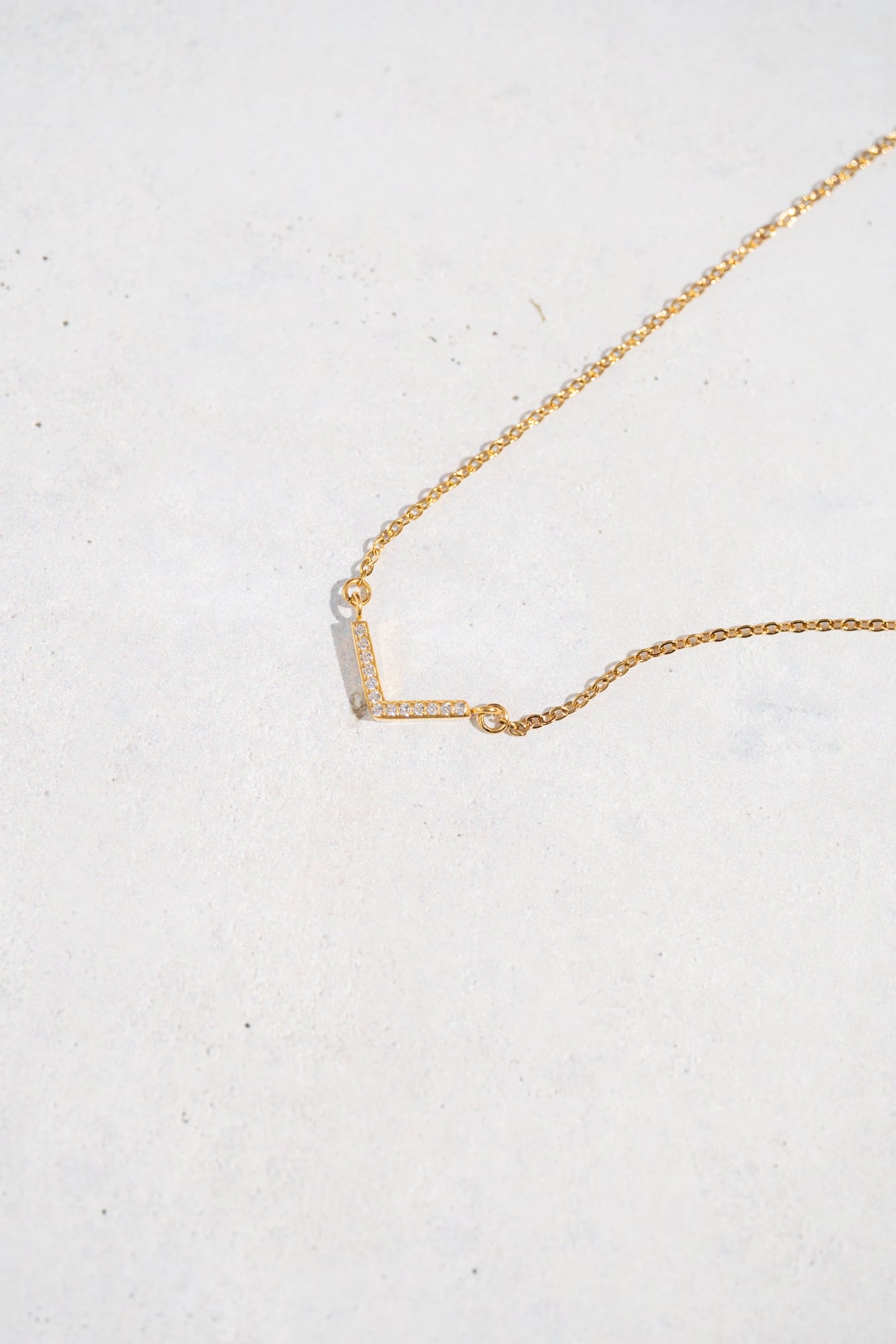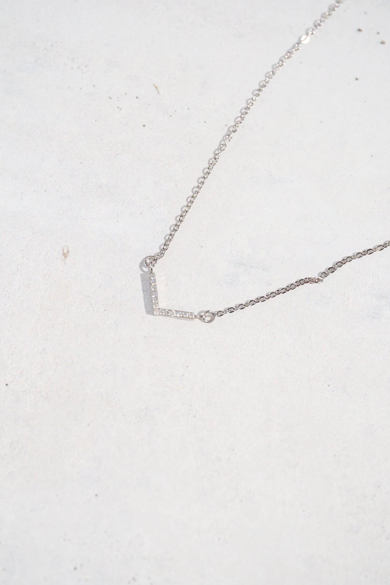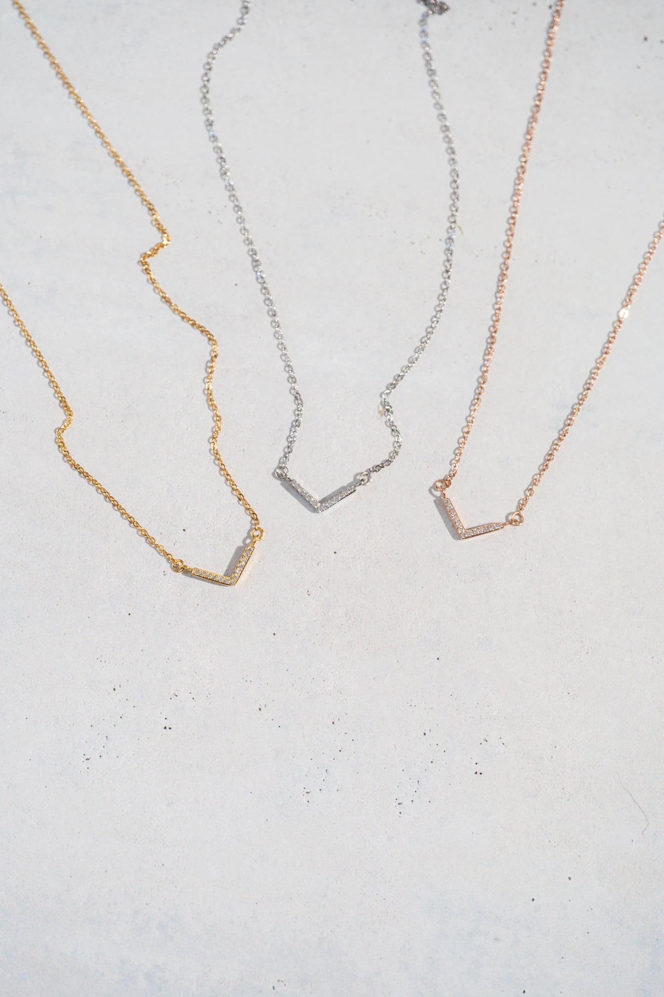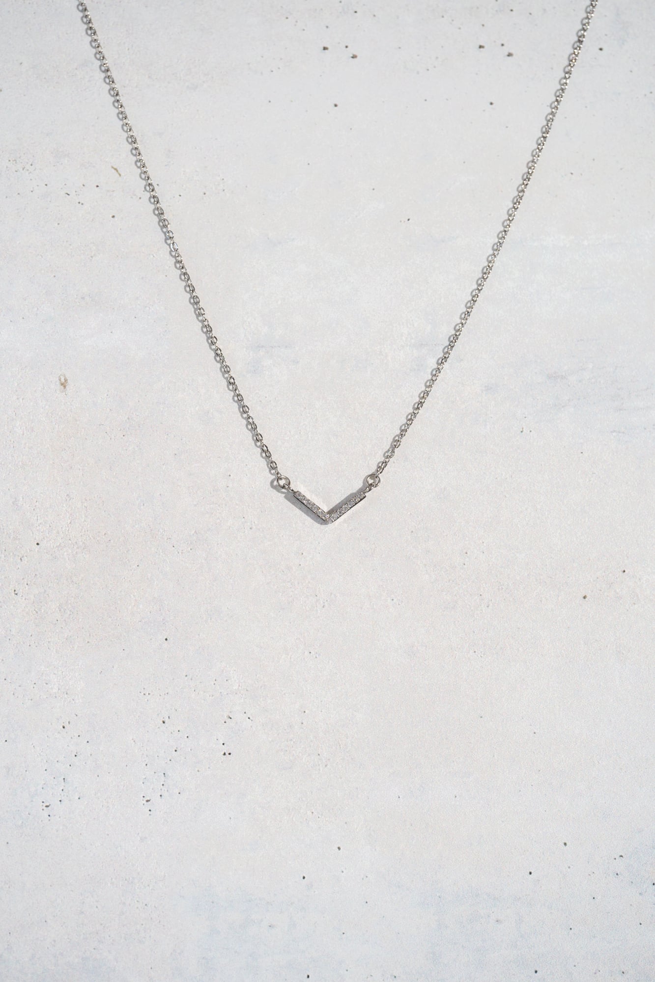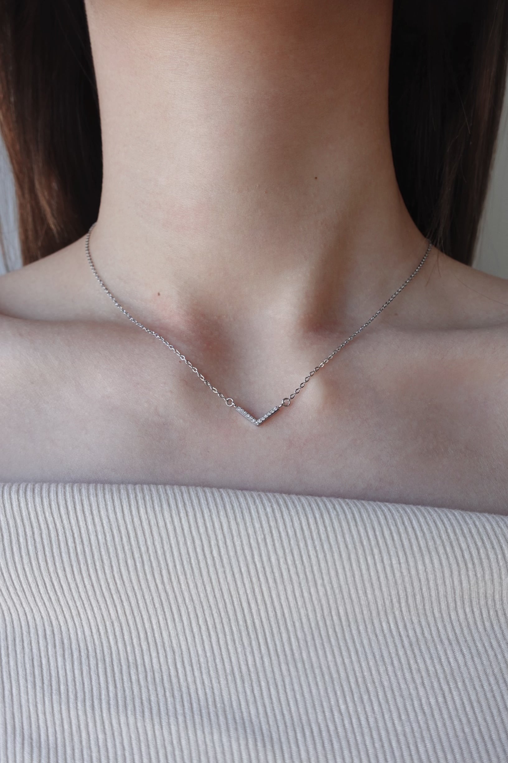 上品なサイズ感で設計したVのペンダントネックレス。モチーフ部分には細かなジルコニアダイアを施し、ミニマルかつ高級感のある仕上げに。