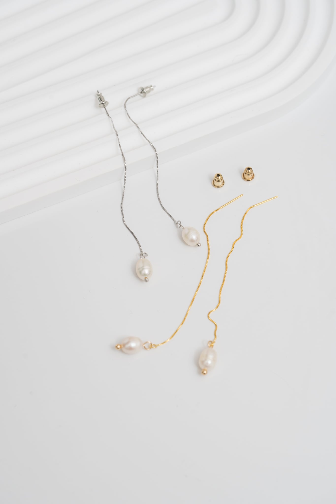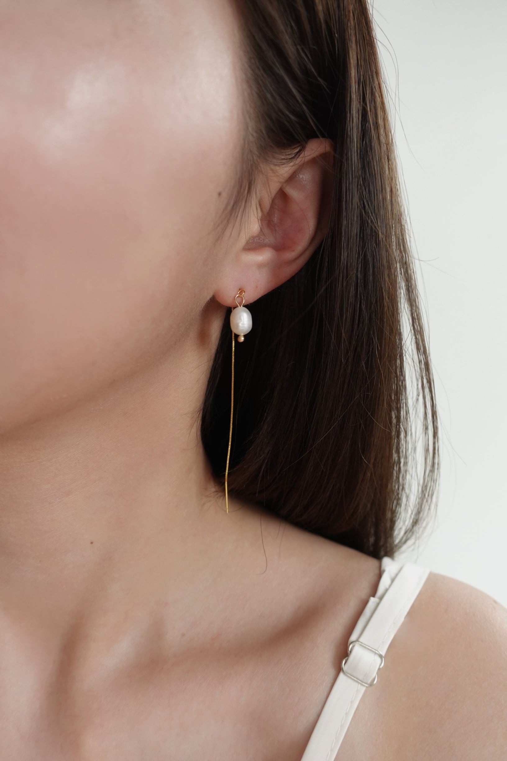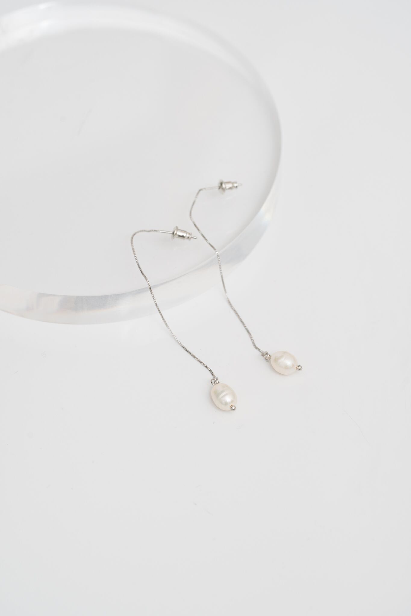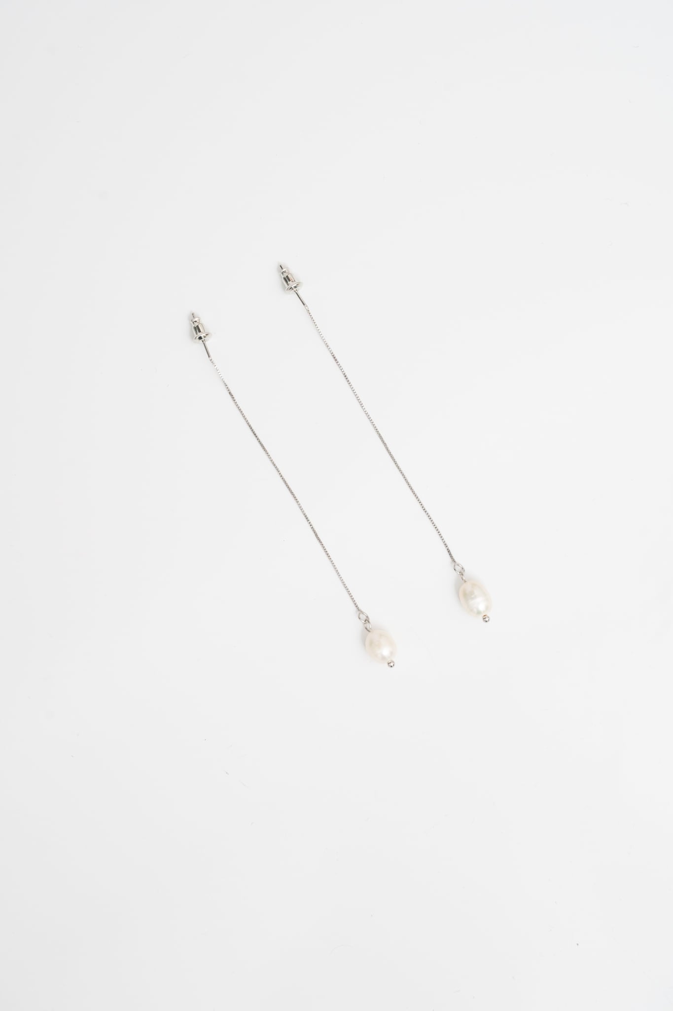 細く繊細なチェーンの先端に淡水パールを設置したアメリカンピアス。