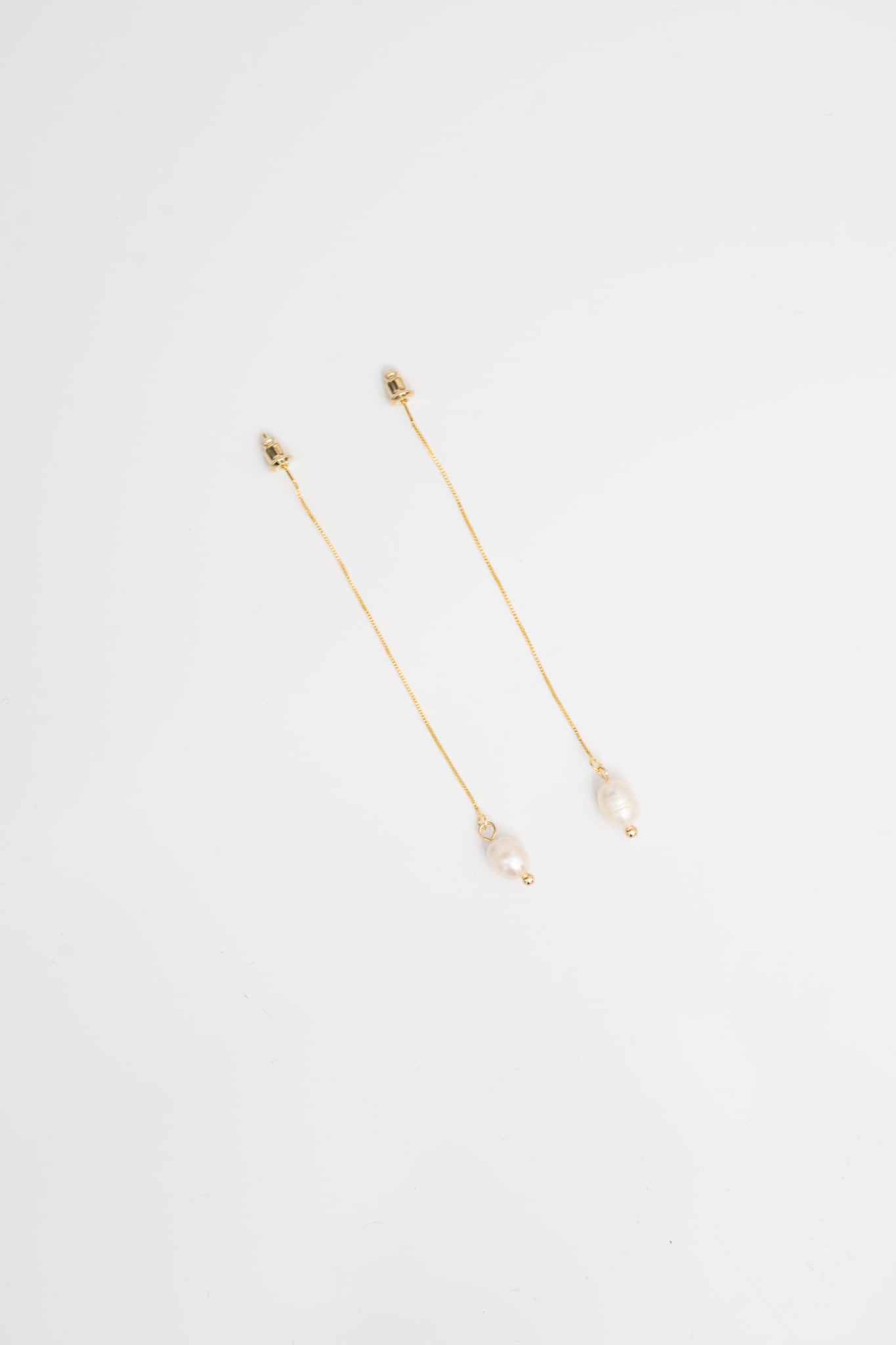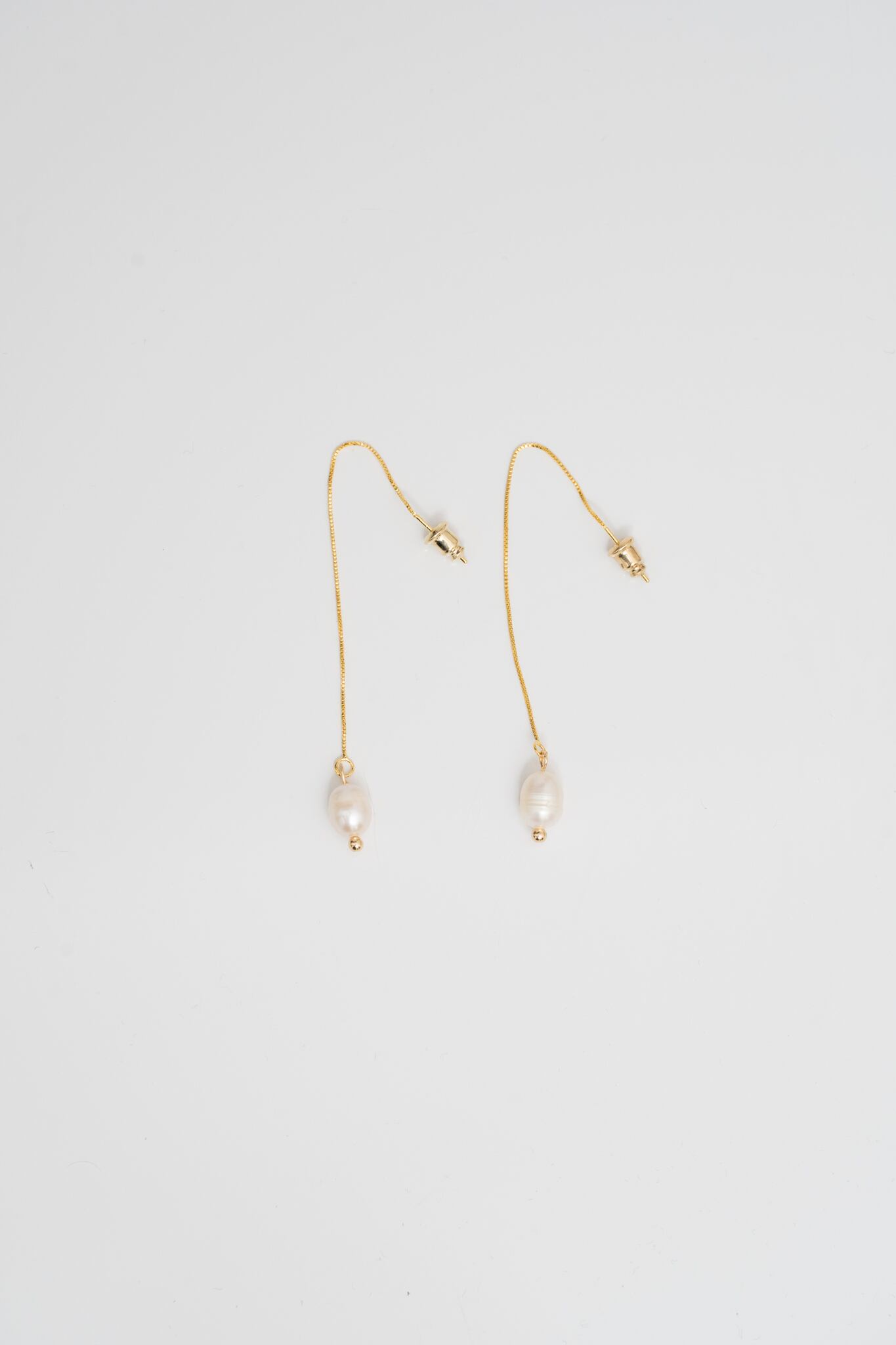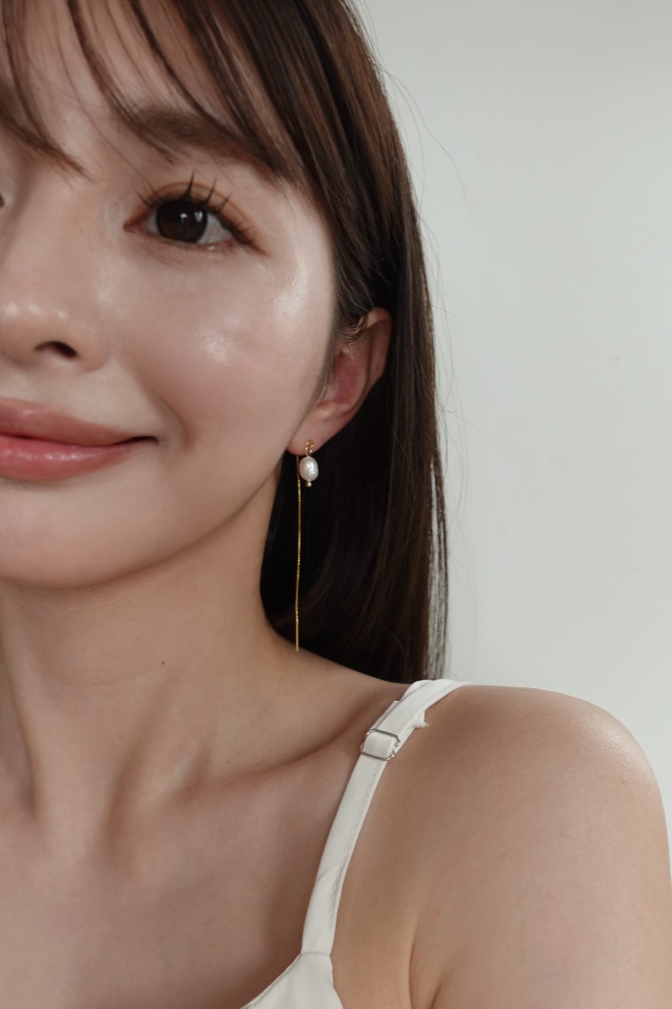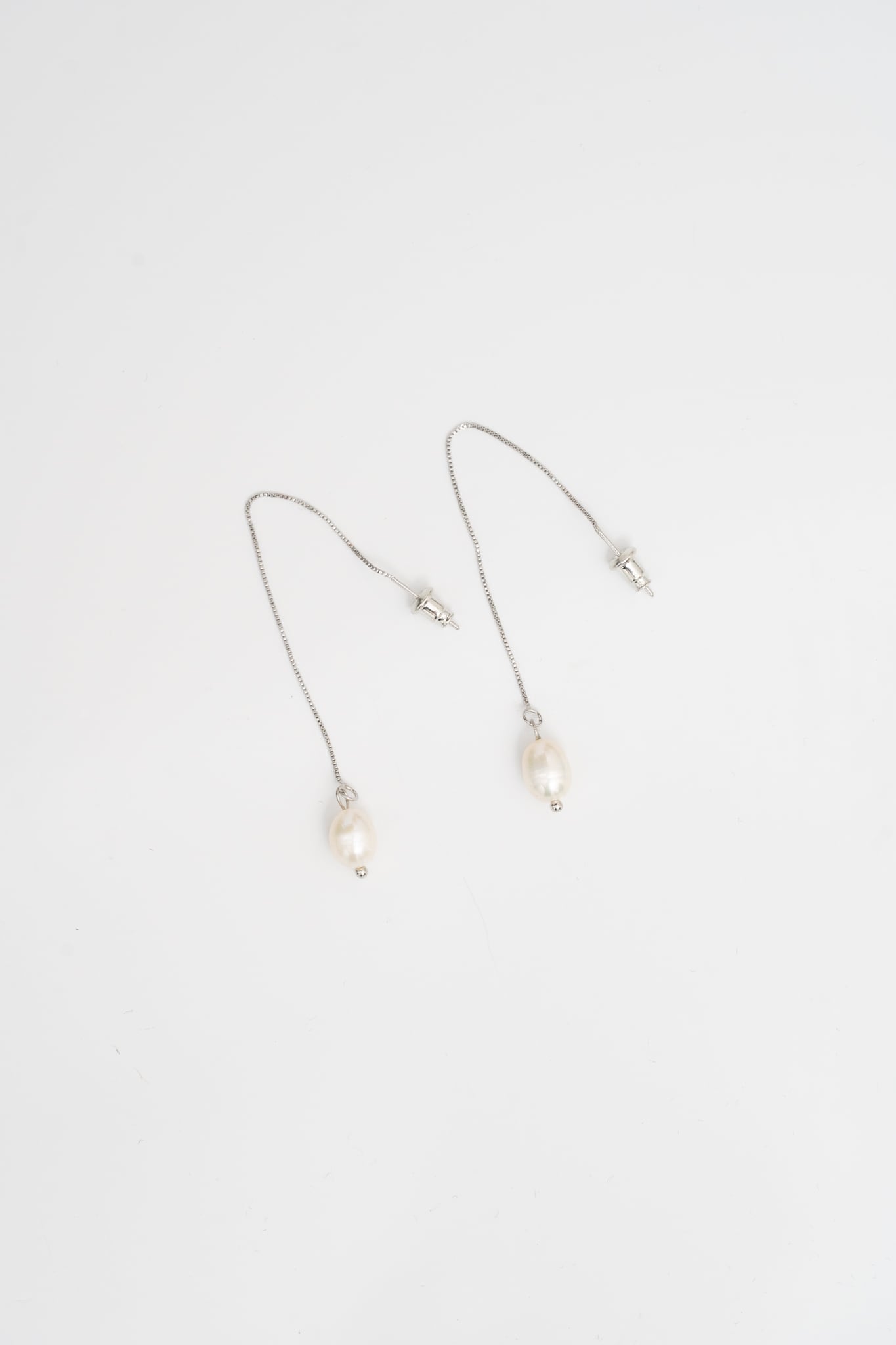 細く繊細なチェーンの先端に淡水パールを設置したアメリカンピアス。
