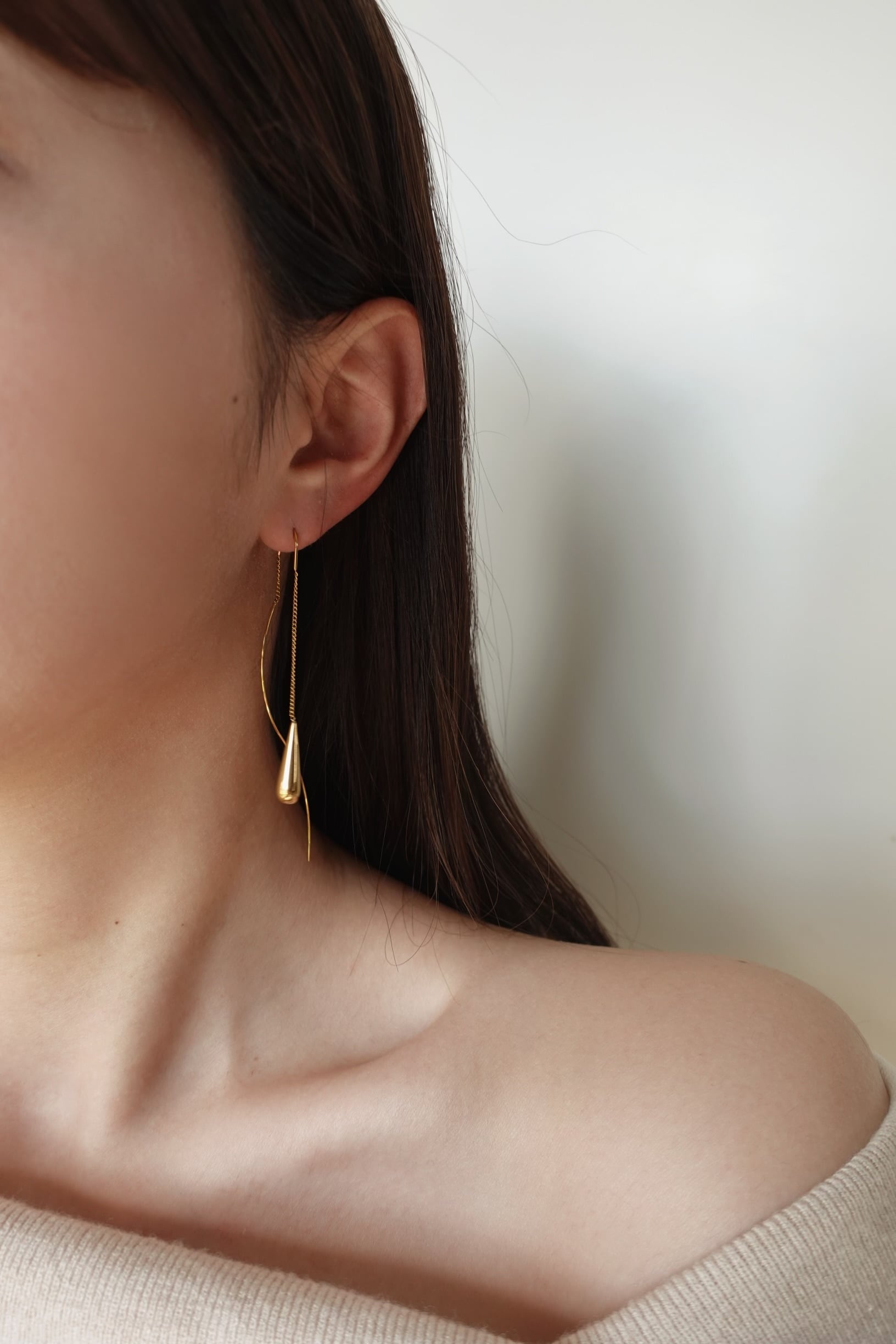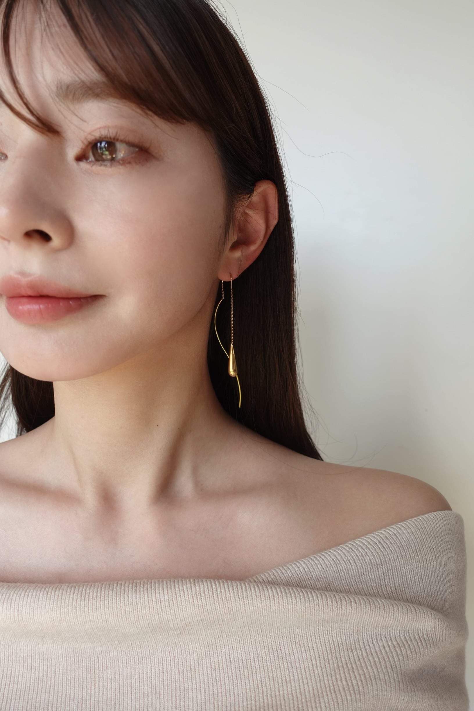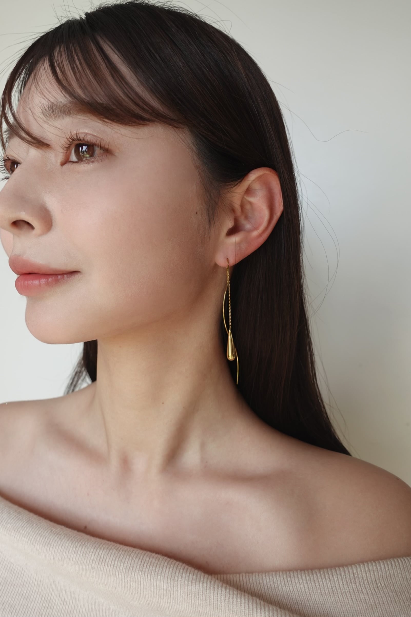 顔まわりで揺れ動くドロップモチーフのチェーンピアス。