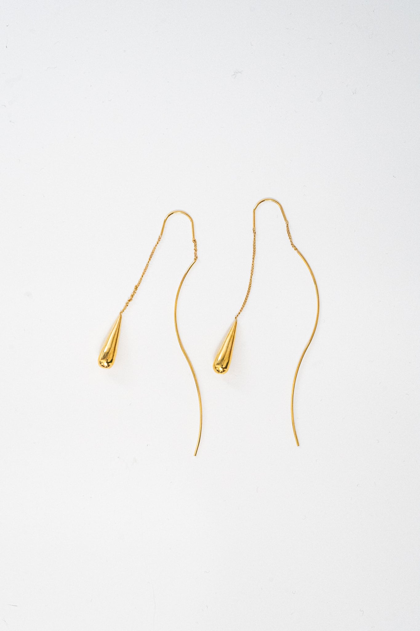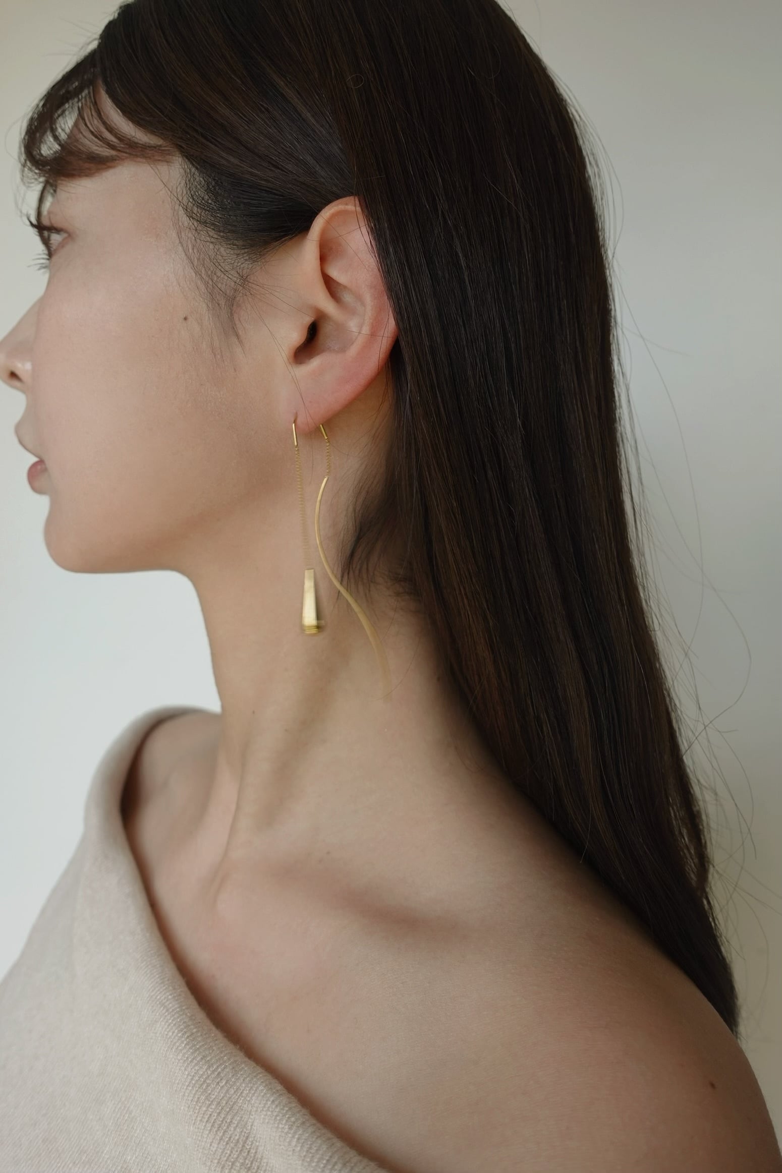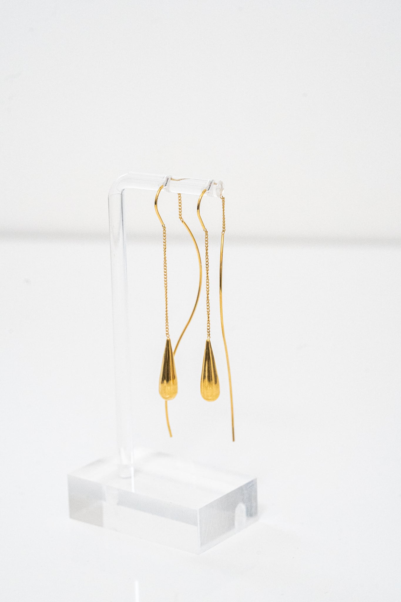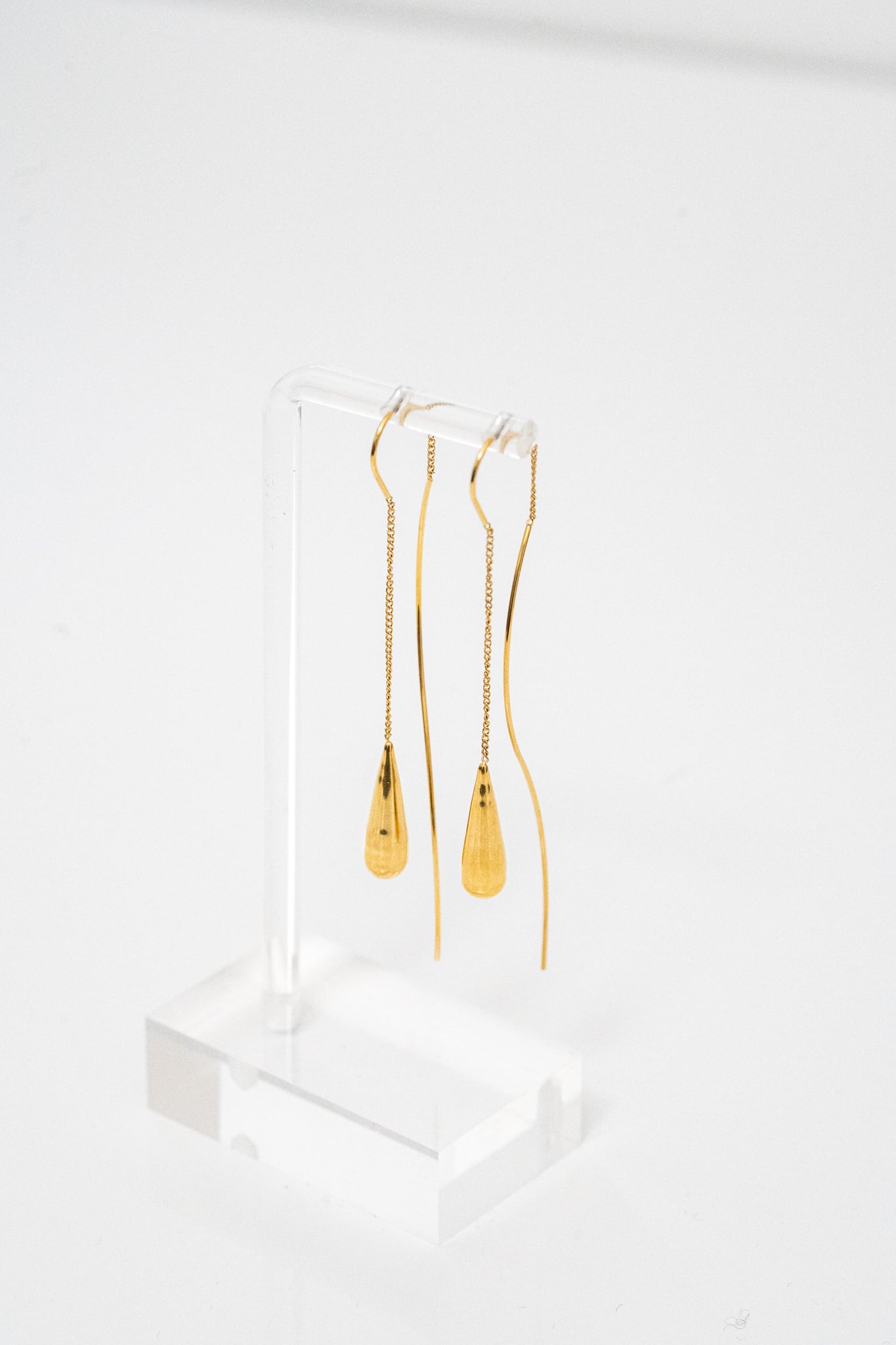 顔まわりで揺れ動くドロップモチーフのチェーンピアス。